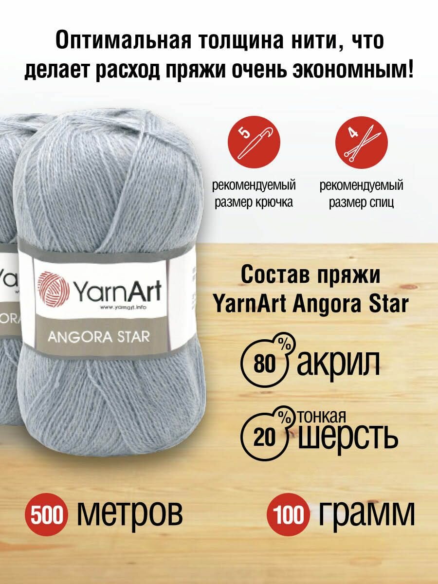 Пряжа для вязания YarnArt 'Angora Star' 100гр 500м (20% тонкая шерсть, 80% акрил) (282 серое небо), 5 мотков
