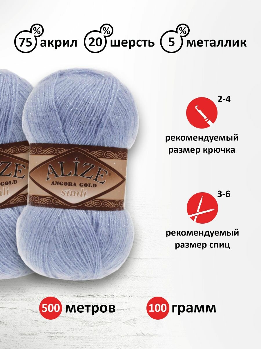 Пряжа ALIZE ANGORA GOLD SIMLI, светлый джинс - 221, 5% металлик, 20% шерсть, 75% акрил, 5 мотков, 100 г, 500 м.