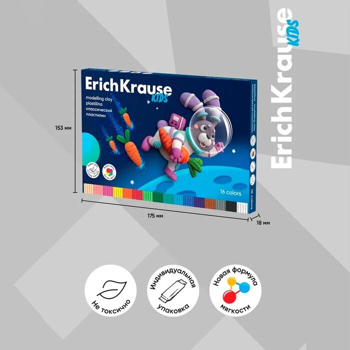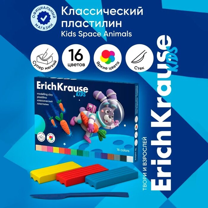 ErichKrause Пластилин 16 цветов, 216 г, ErichKrause "Kids Space Animals", со стеком, в картонной упаковке интересное: