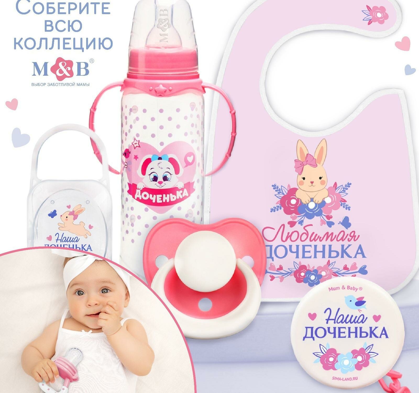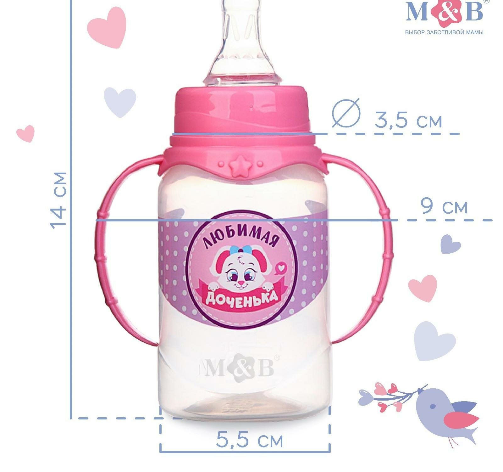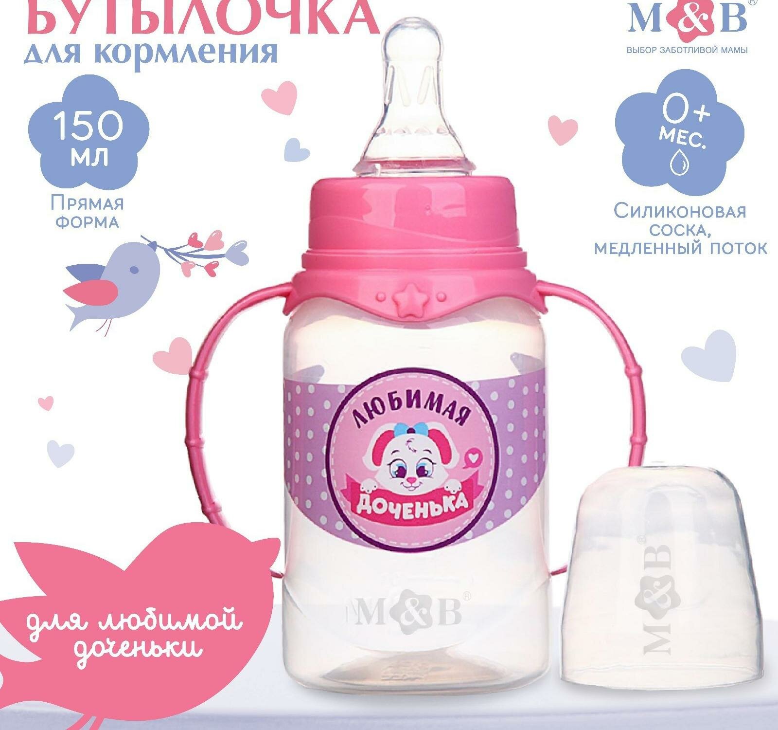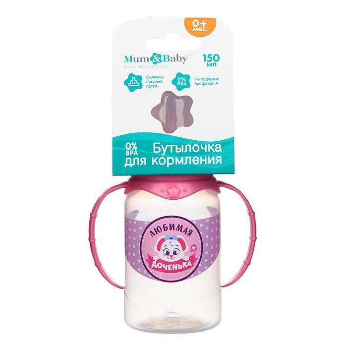 Бутылочка для кормления Mum&Baby "Доченька", классическое горло, с ручками, 150 мл, от 0 мес, цвет розовый (150 мл., Цилиндр - ручки/рисунок)