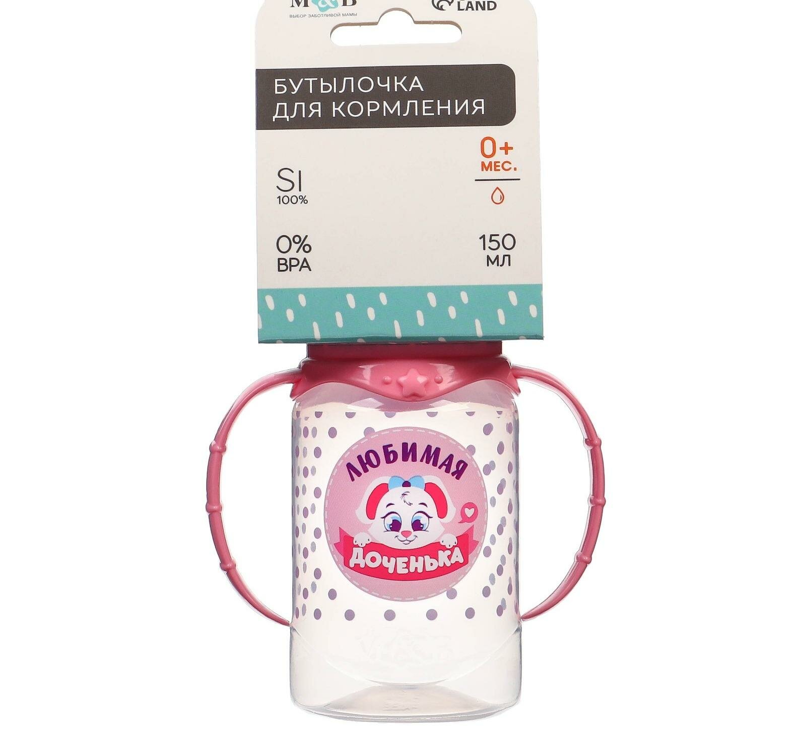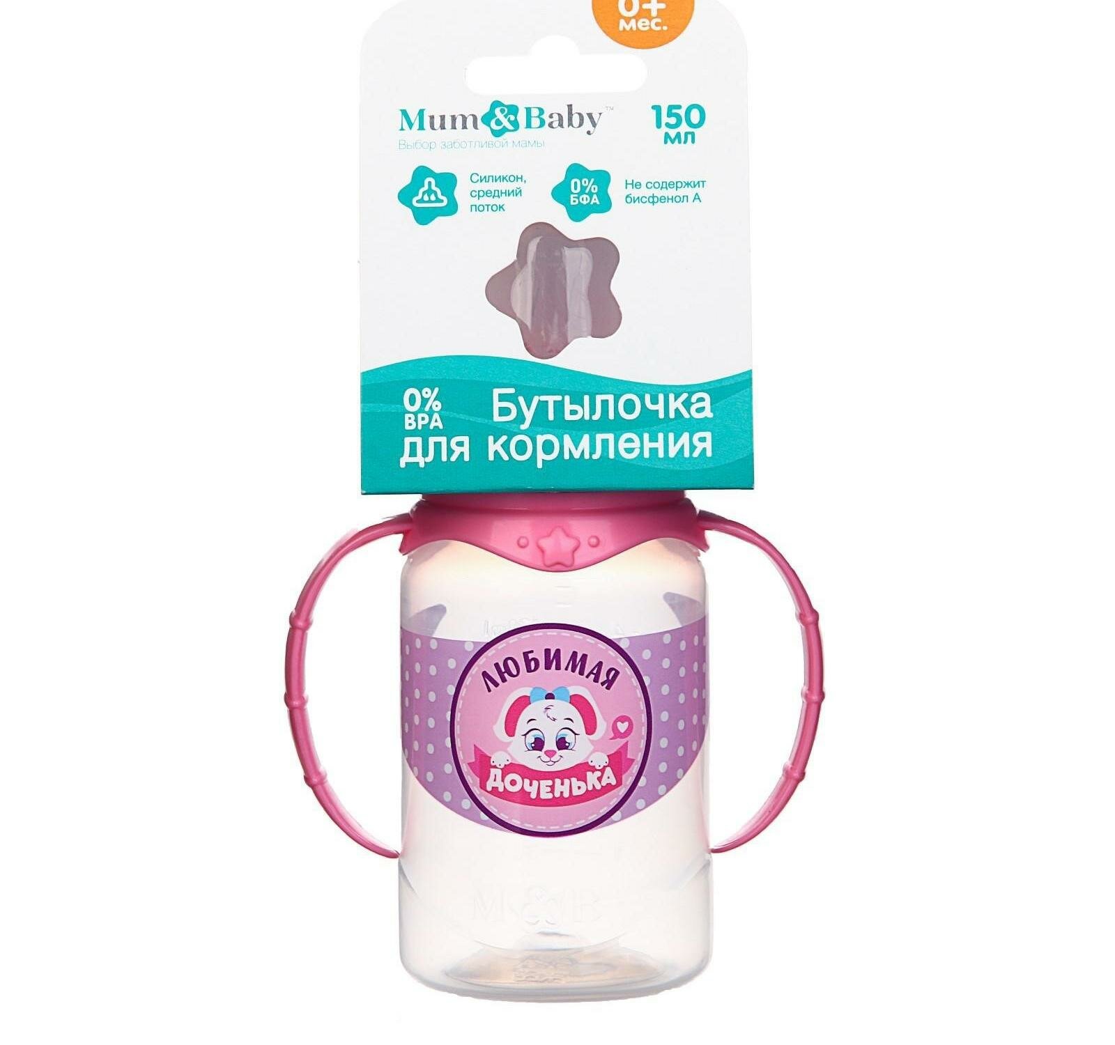 Бутылочка для кормления «Доченька» детская классическая, с ручками, 150 мл, от 0 мес, цвет розовый