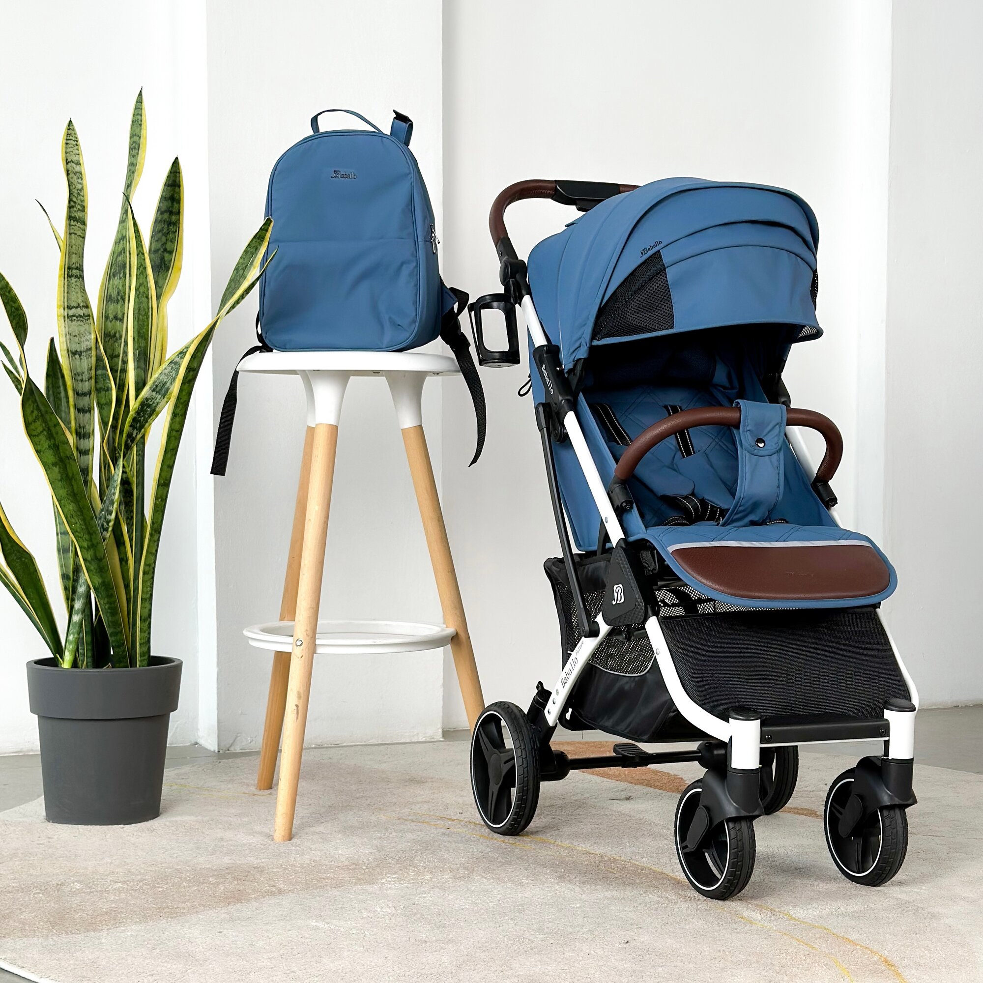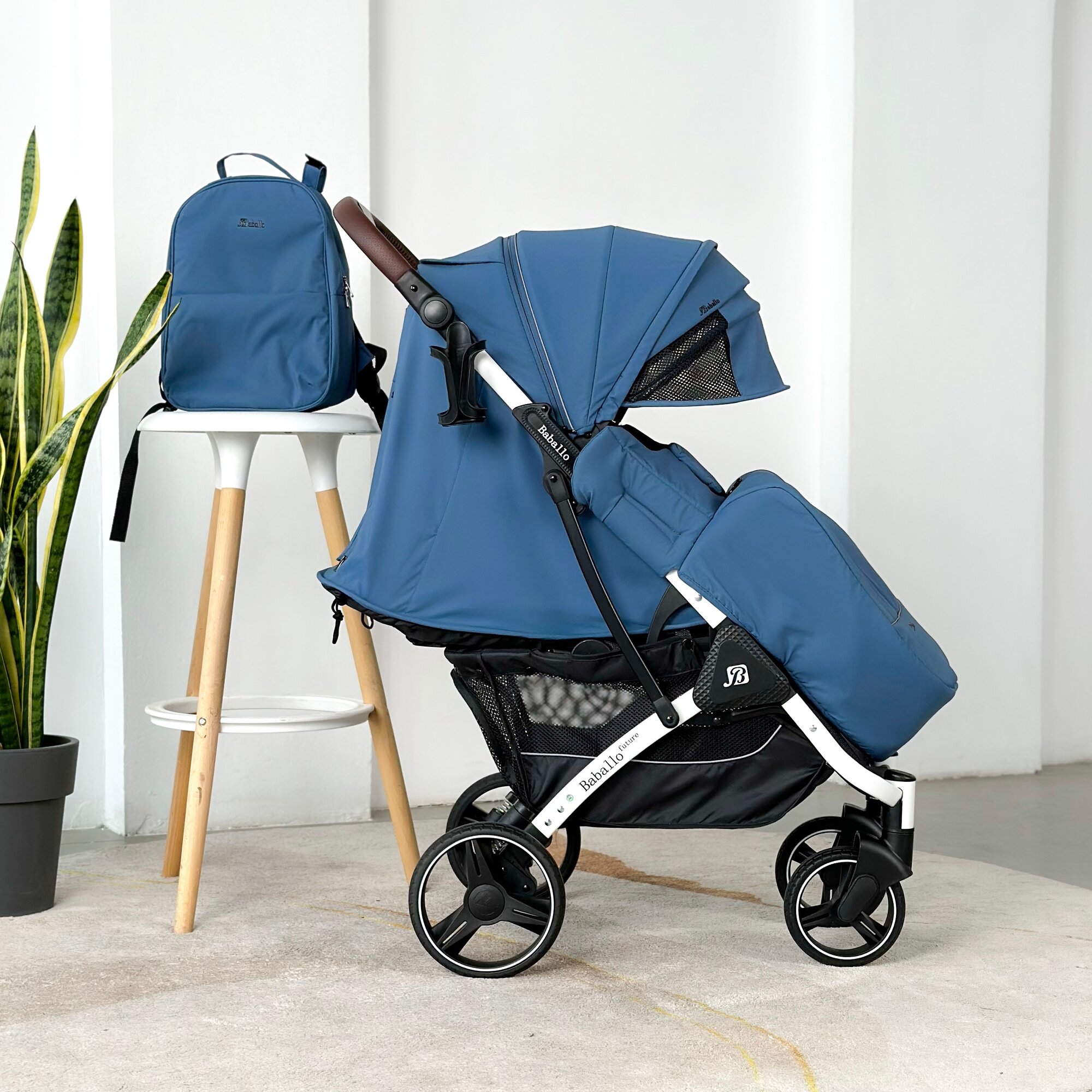 Коляска прогулочная Baballo 2024 темно-синяя/белая рама + рюкзак (механическая регулировка спинки)