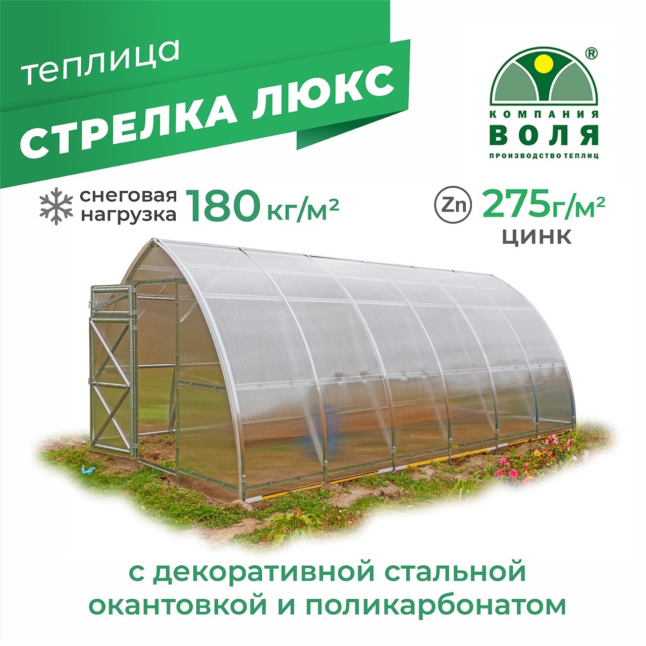 Теплица "Дачная Стрелка Люкс 3" 8м с поликарбонатом "воля Стандарт" и декоративной окантовкой