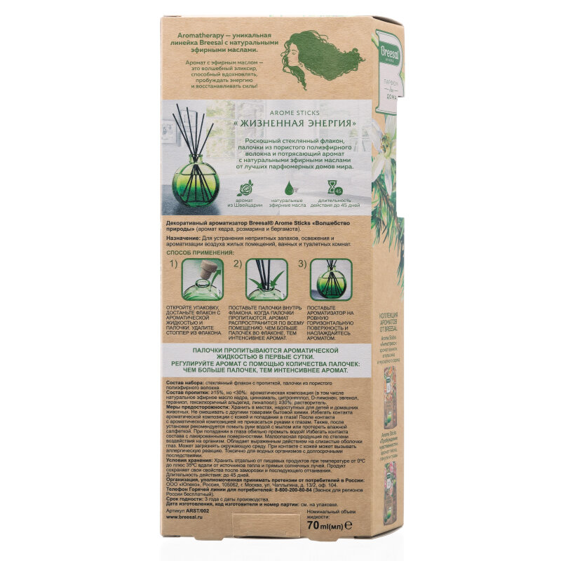 Купить Ароматизатор для дома, Диффузор ароматический с палочками Breesal Arome Sticks Жизненная энергия 70 мл