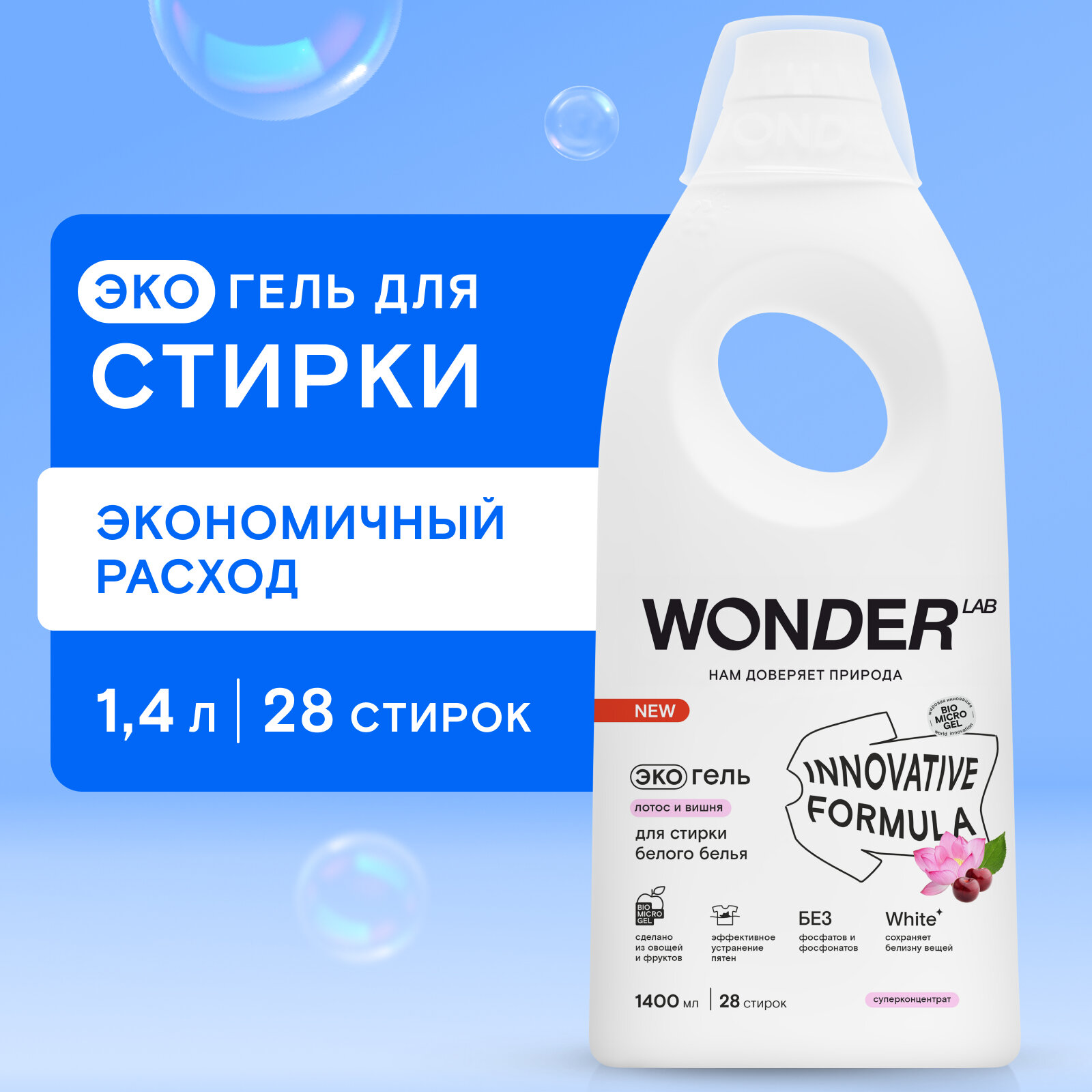 Эко гель для стирки белого белья и белых вещей WONDER LAB, гипоаллергенный жидкий порошок с ароматом лотоса и вишни, 28 стирок, 1,4 л