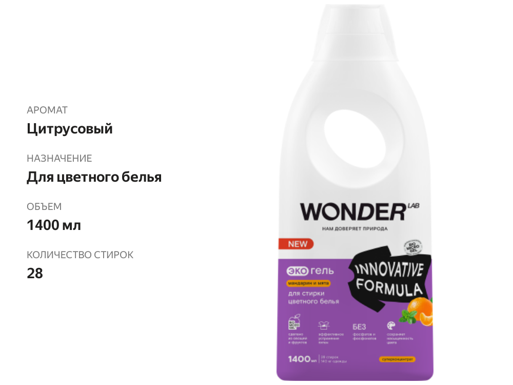 СохранитьWONDER LAB ЭкоГель для стирки цветного белья Мандарин и Мята, 1,4л интересное: