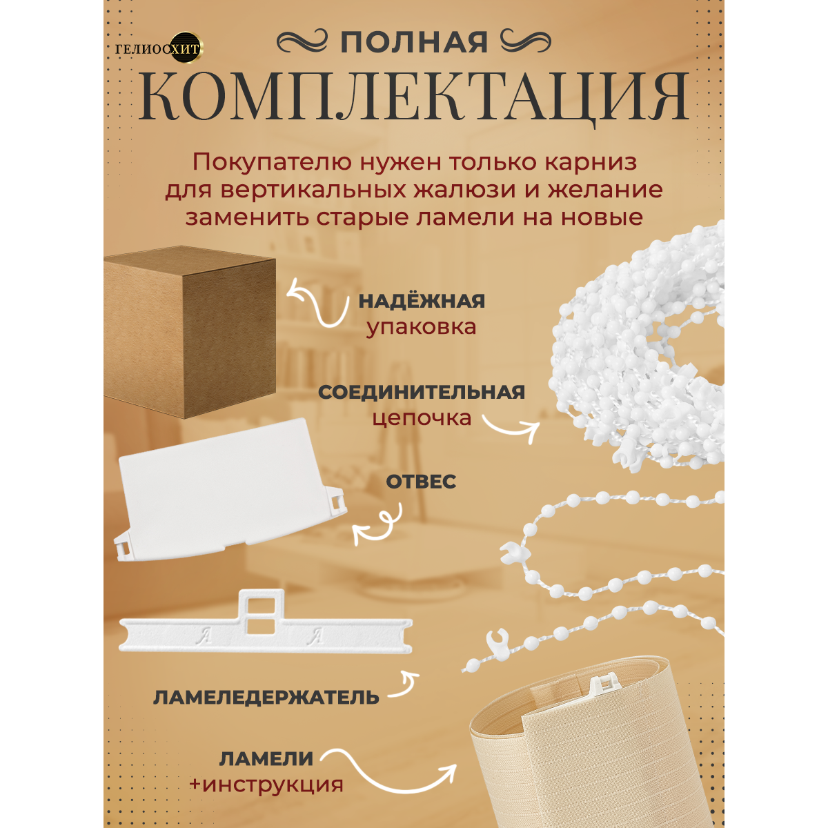 Ламели для вертикальных жалюзи 10 шт высотой 205 см темно-бежевого цвета, карниз приобретается отдельно, гелиосхит.