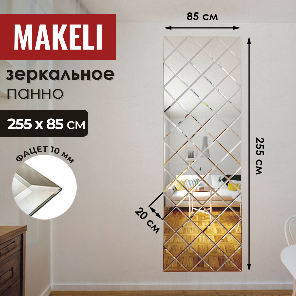 Зеркальное панно Makeli, серебро, квадрат 20x20 см, 142x0,85 м