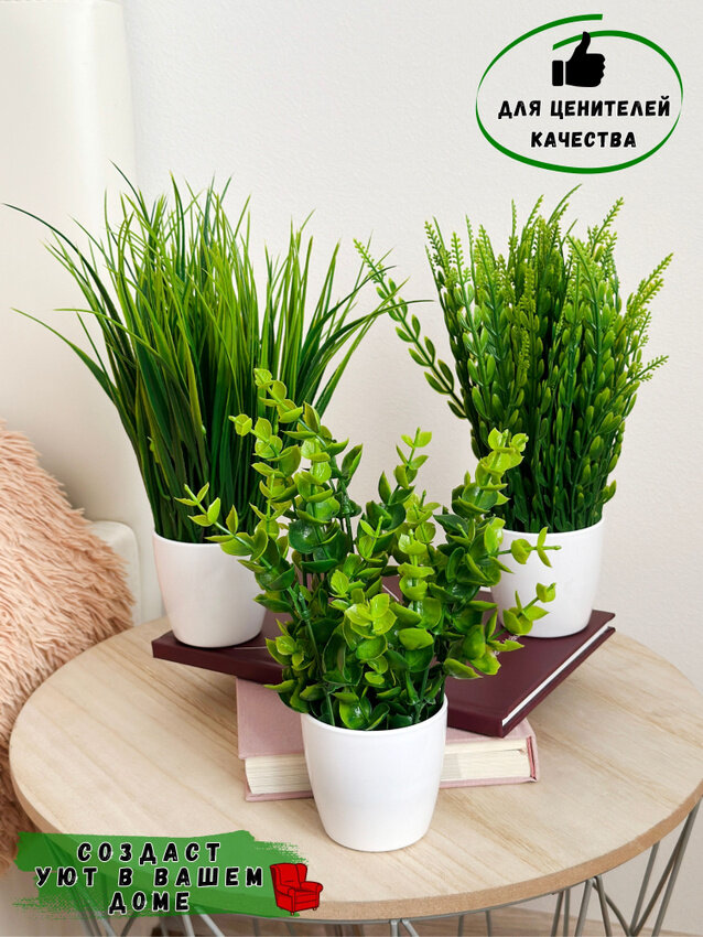 Искусственные цветы Осока и Эвкалипт в горшке 3 композиции Высота 23 см / Декор для дома