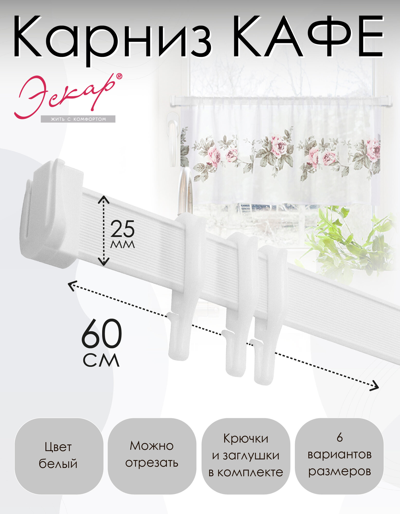 | Комплектация | Пластиковый профиль (ПВХ-композиция), крючки (POM), заглушки (ABS) , крепления (ABS), скотч (ППЭ), саморезы (металл) |