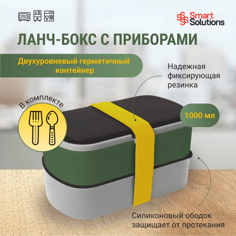 Купить Ланч-бокс с приборами Smart Solutions Food Time 1л, зеленый, серый (SS-LBDL-PP-GRN-1)