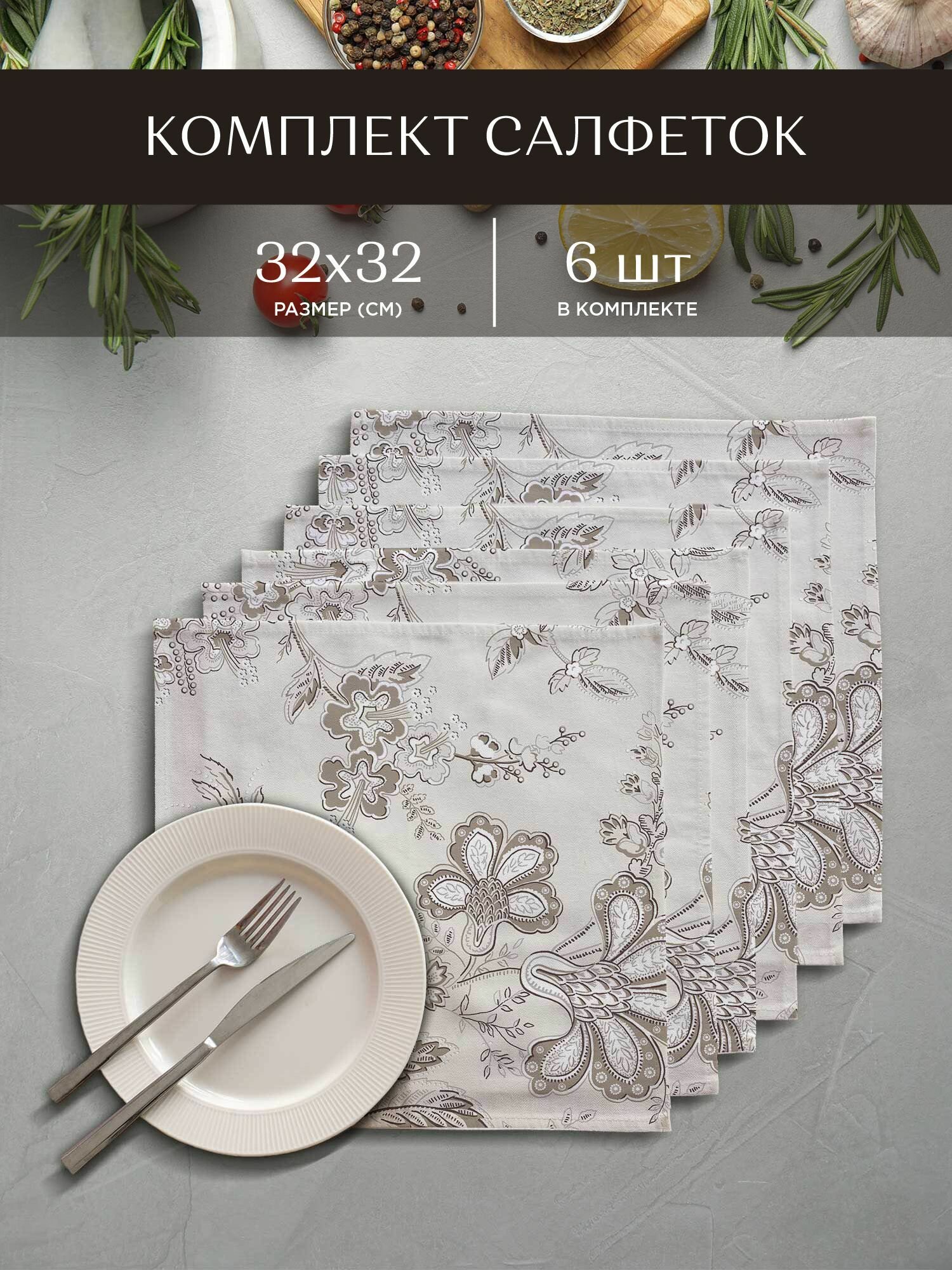 Салфетки на стол сервировочные 32х32 (6 шт) / набор сервировочных салфеток из хлопка "Унисон" рис 33014-1 Сell