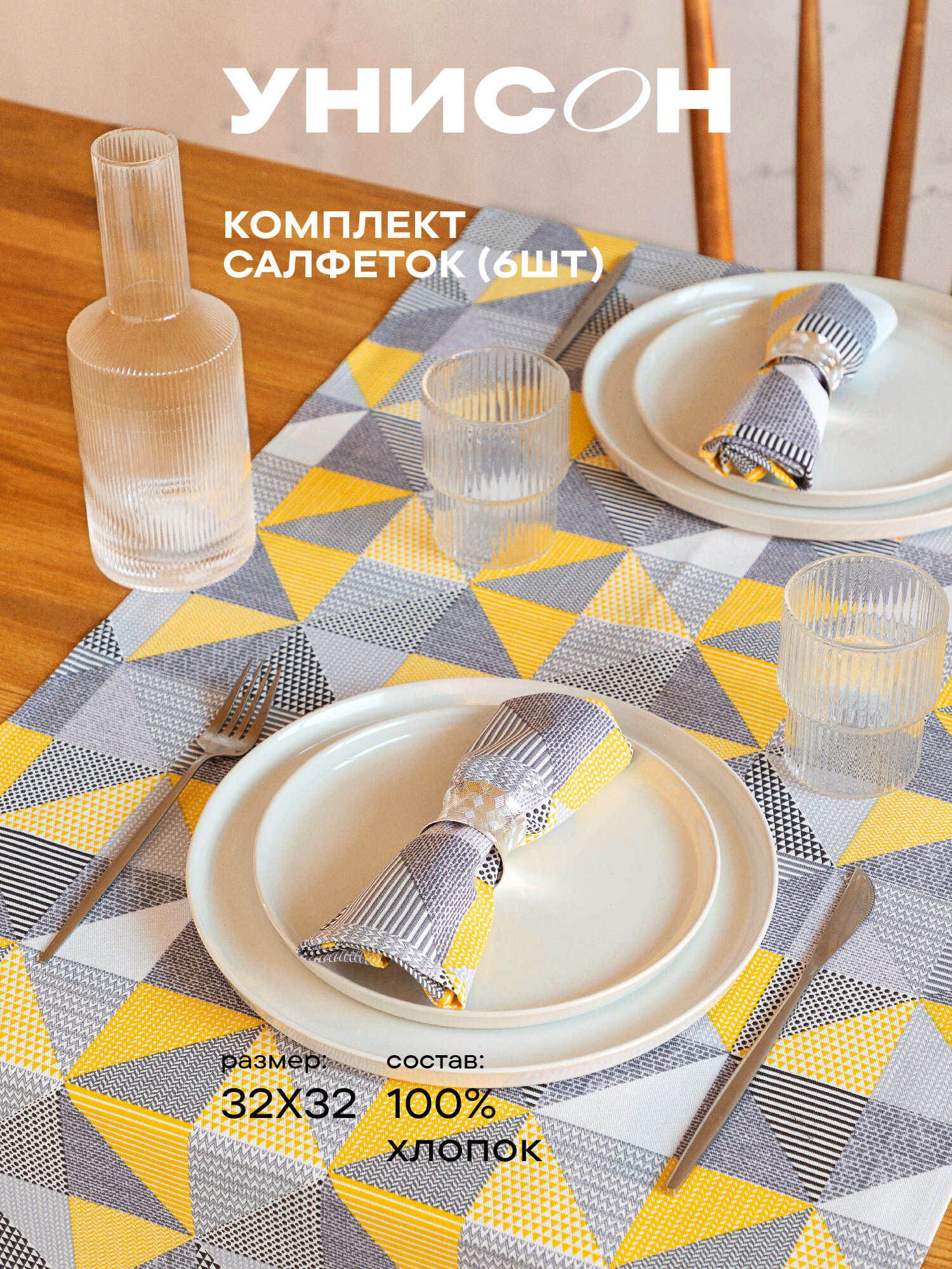 Салфетки на стол сервировочные 32х32 (6 шт) / набор сервировочных салфеток из хлопка "Унисон" рис 33014-1 Сell