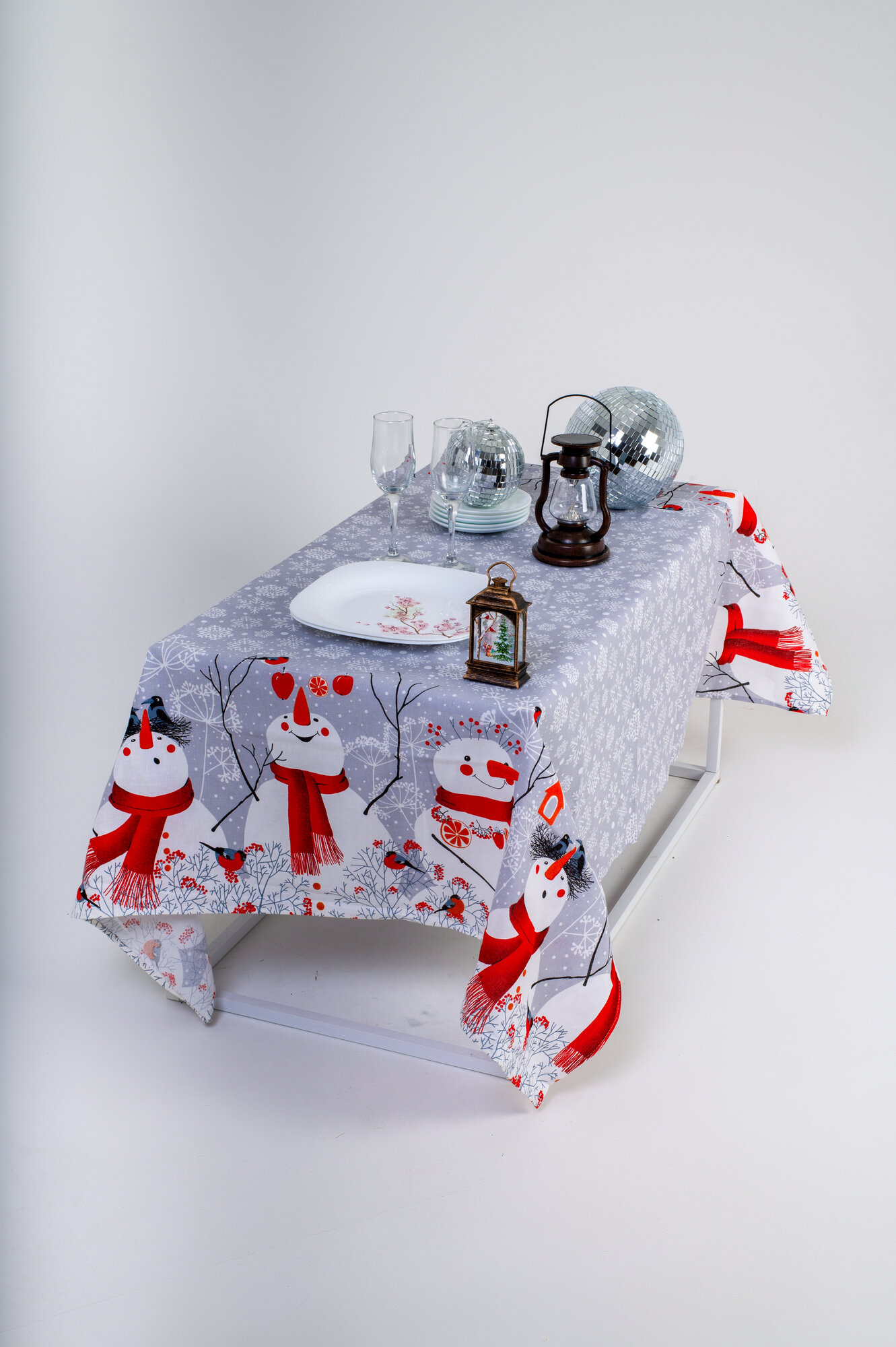 Скатерть столовая АртПостель, «Снеговики СБ. 150*180» из рогожки 180*145см, новый год 2024, серая, снежинки