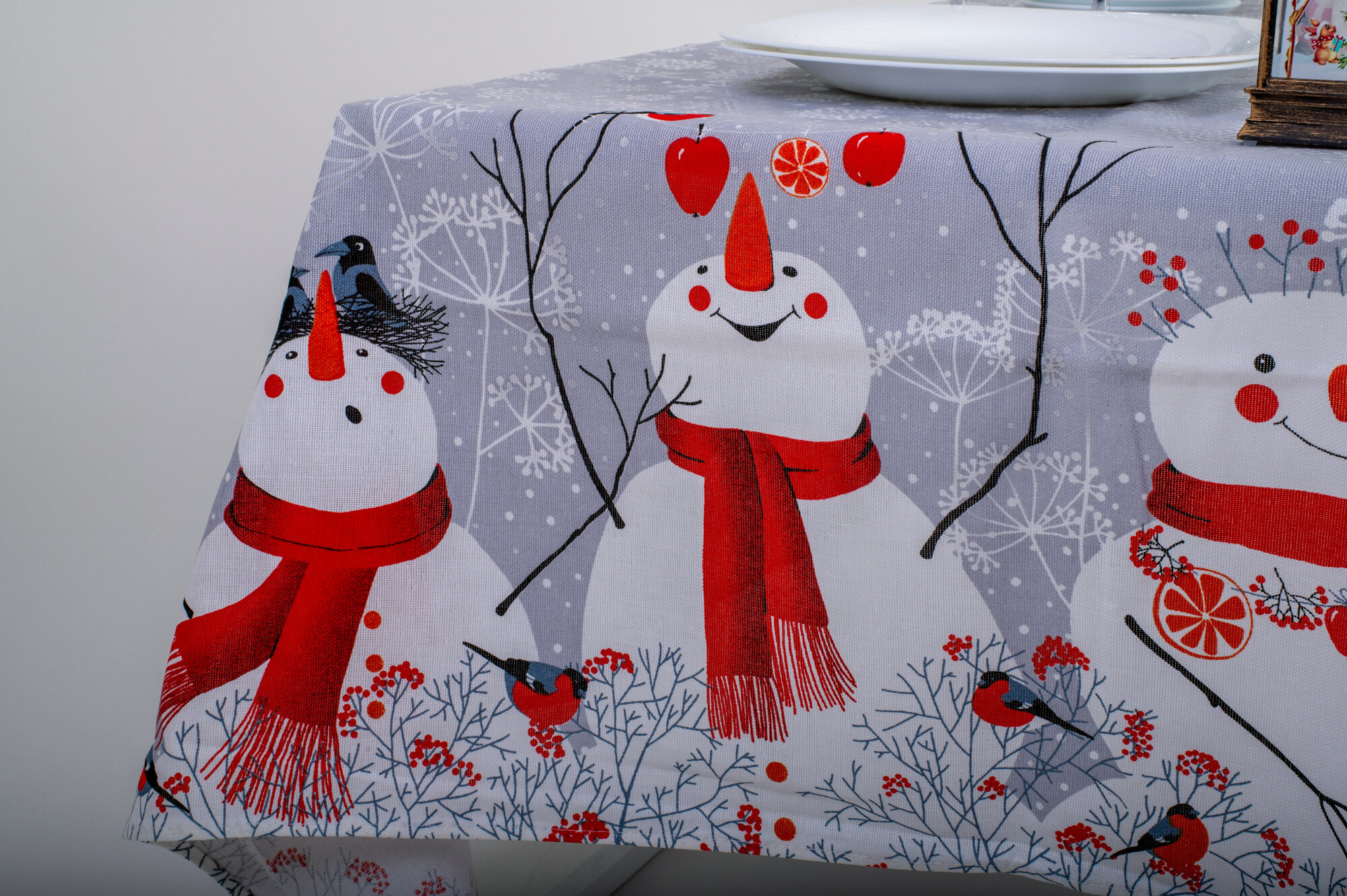 Скатерть столовая АртПостель, «Снеговики» из рогожки 260*145см, новый год 2024, серая, снежинки