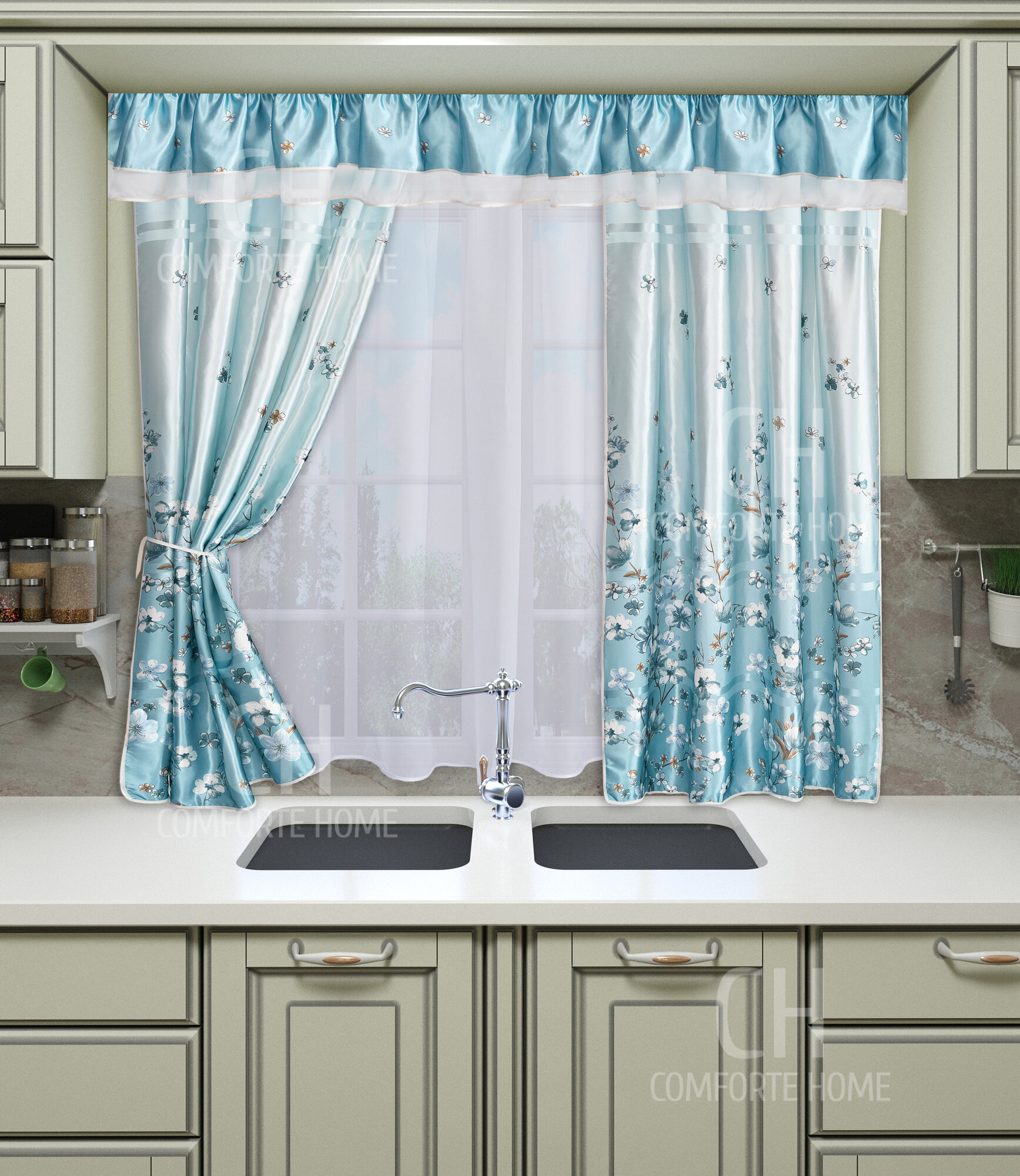 Комплект шторы и тюль на кухню с ламбрикеном Морская волна