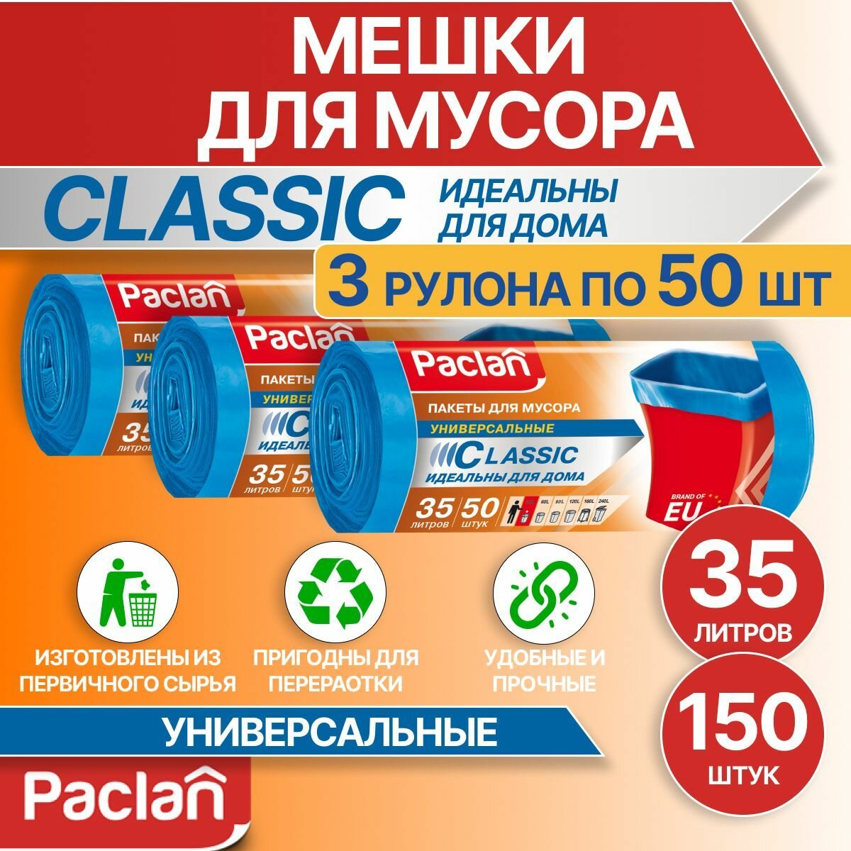 Мешки для мусора 35 л, 3 рулона по 50 шт, синие, CLASSIC, Paclan интересное: