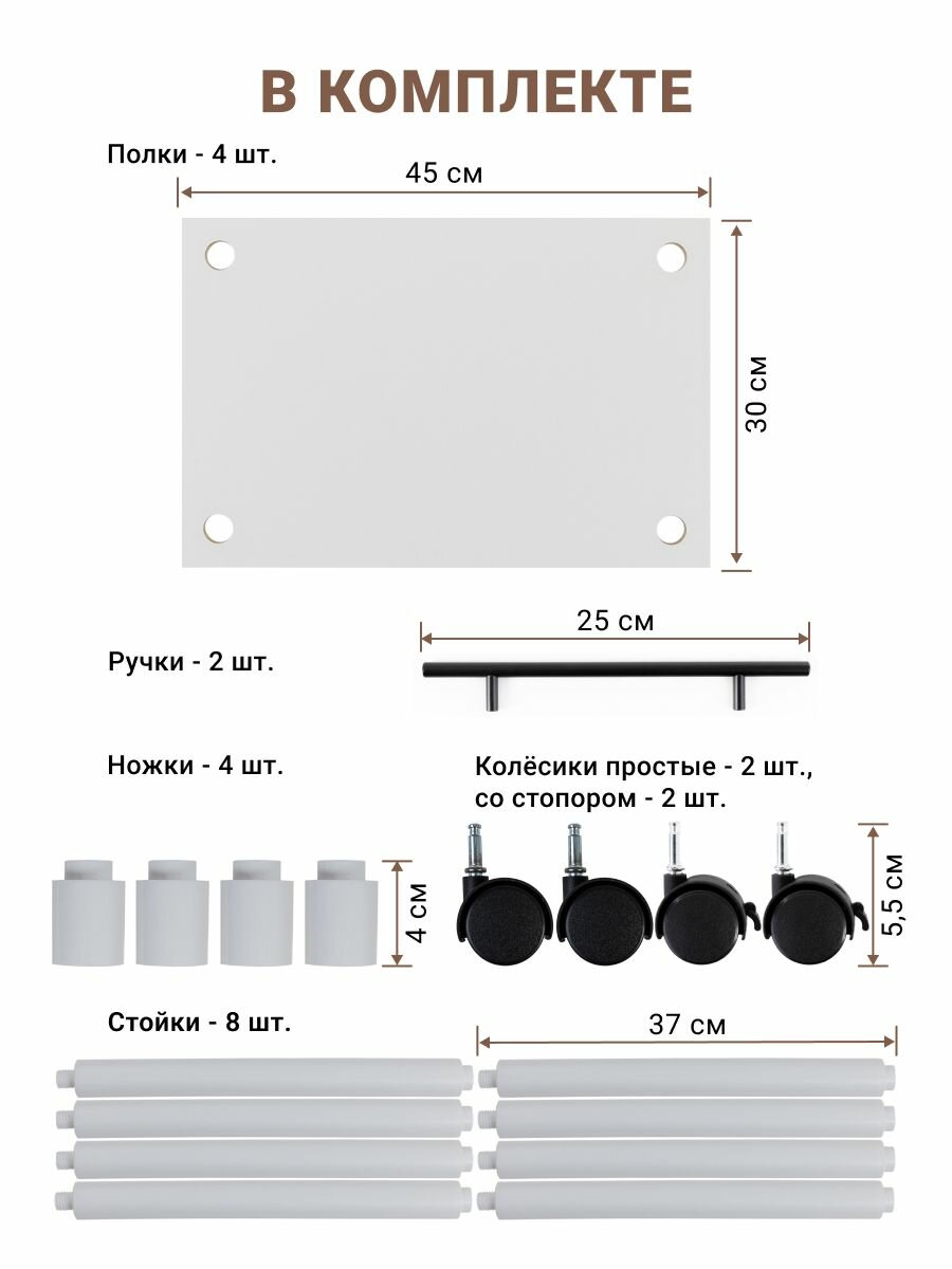 | Дополнительная информация | Стойка пластиковая - 8 шт; Полка ЛДСП - 3 шт; колеса из пластика - 4 шт |