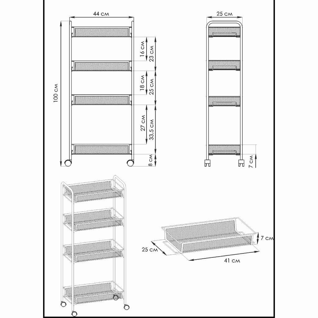 | Дополнительная информация | материал: стальная труба, просечно-вытяжной лист, проволока, пластик, полимерное покрытие; вес этажерки – 3.4 кг |