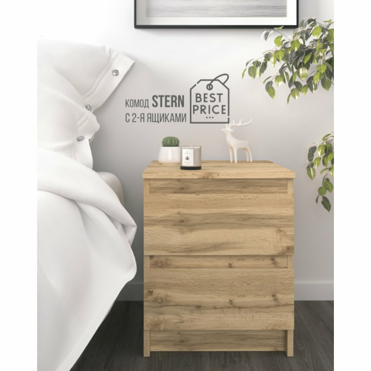 Купить STERN Т-1, прикроватная тумба, 40х49,7х43,3 см, 2 ящика, дуб вотан