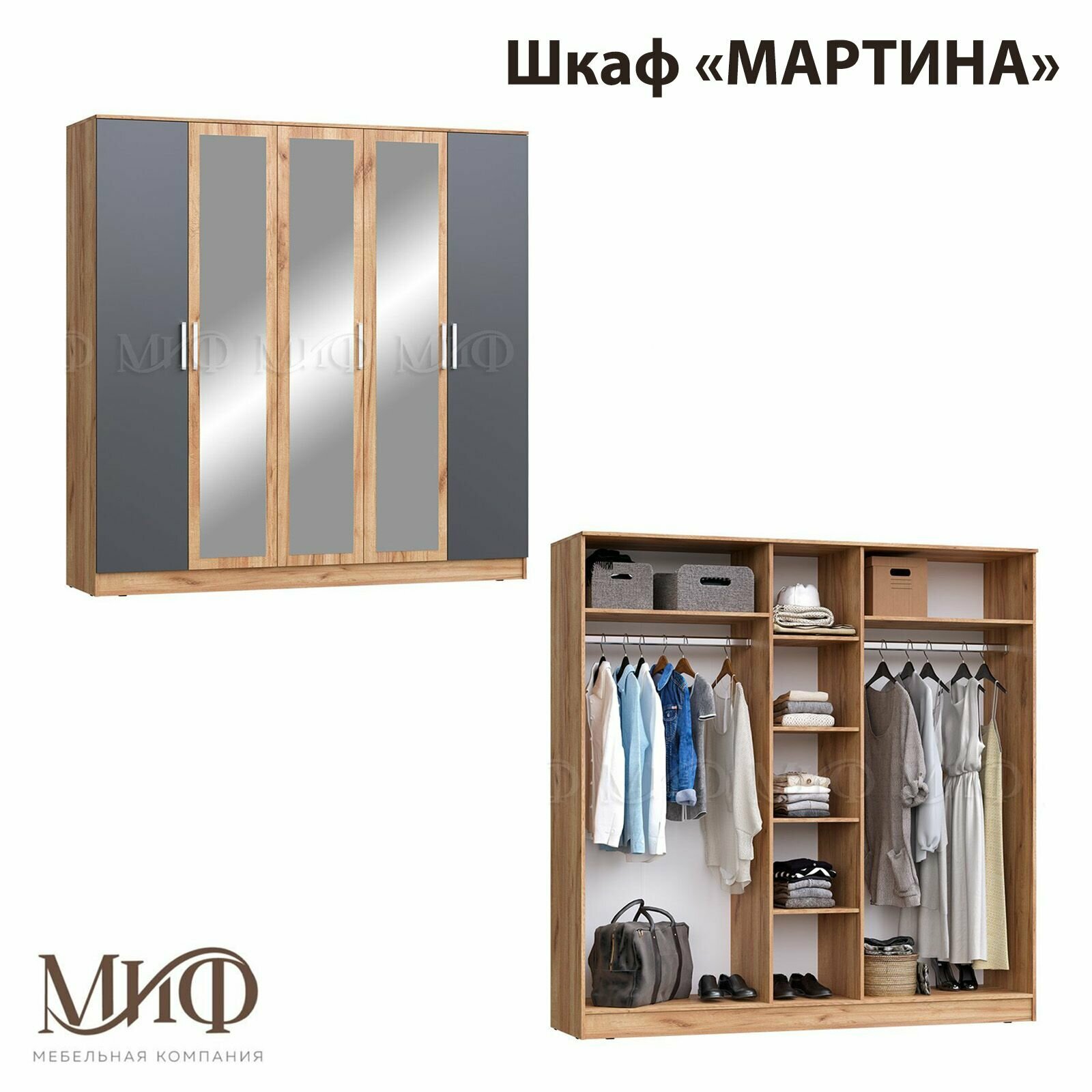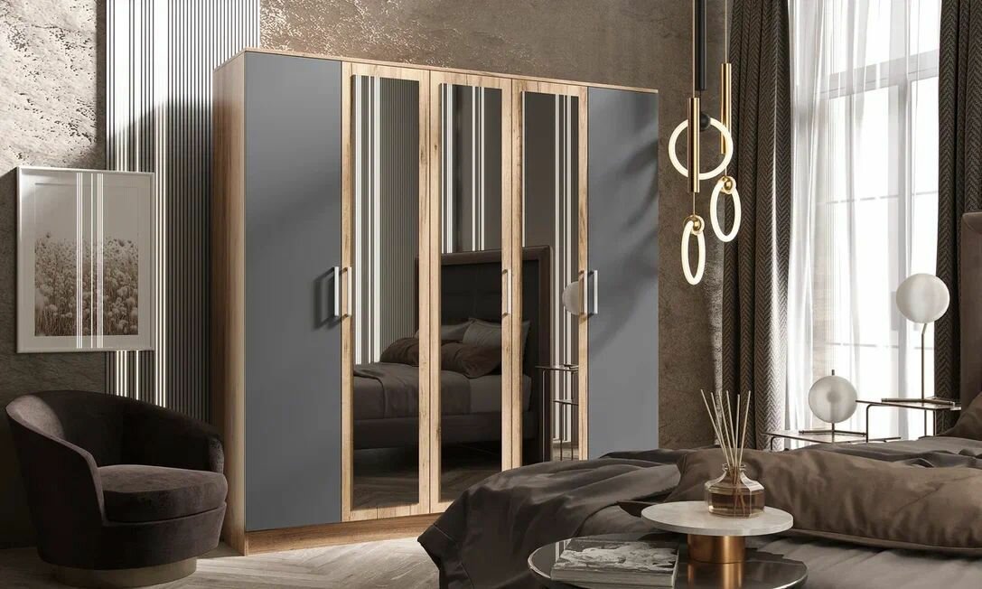 Шкаф распашной для одежды 5-дверный Мартина с зеркалом Графит, Дуб крафт ЛДСП