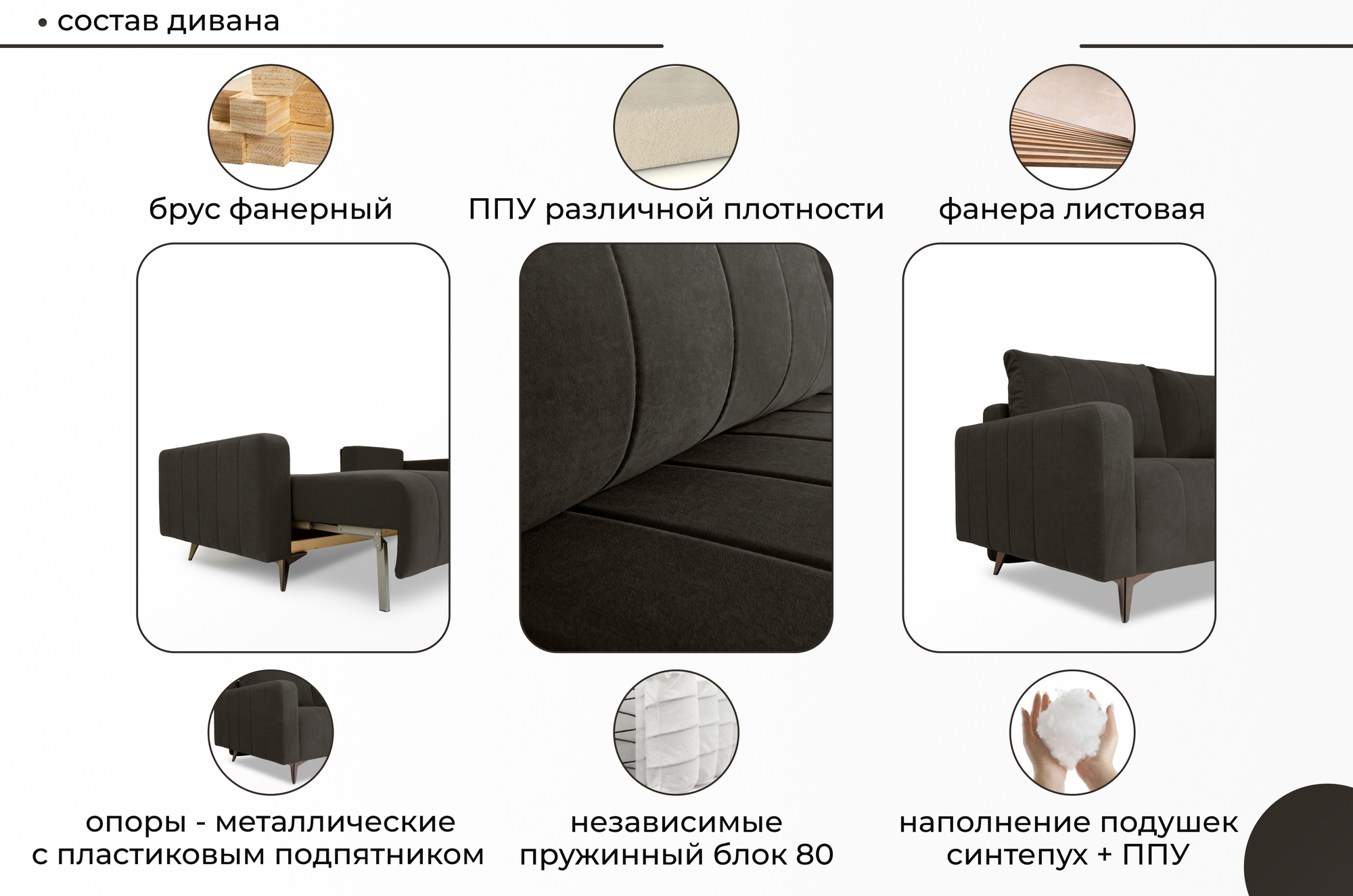 | Особенности | пружинный блок, раскладная конструкция, с подлокотниками, съемные подушки, ящик для белья |