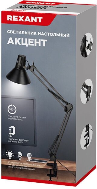 Купить Лампа электрическая настольная Rexant Акцент, с винтовым зажимом, антрацит