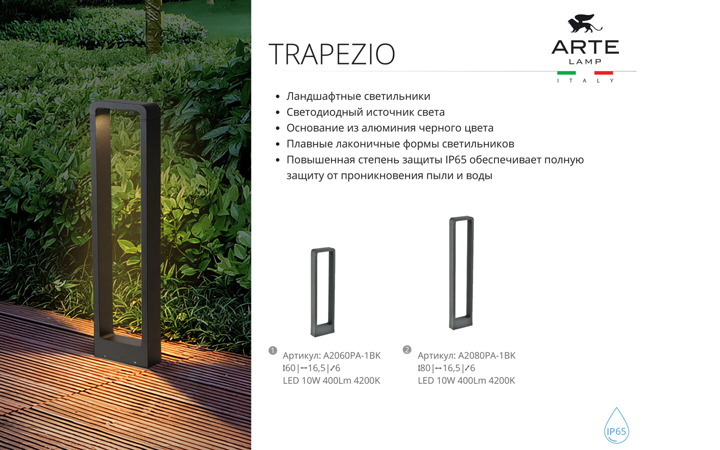 Ниже Вы можете прочитать отзывы на Ландшафтный уличный светильник в стиле модерн Arte Lamp TRAPEZIO A2080PA-1BK, ознакомится с подробными характеристиками, посмотреть интересные обзоры и фотографии на Ландшафтный уличный светильник в стиле модерн Arte Lamp TRAPEZIO A2080PA-1BK.