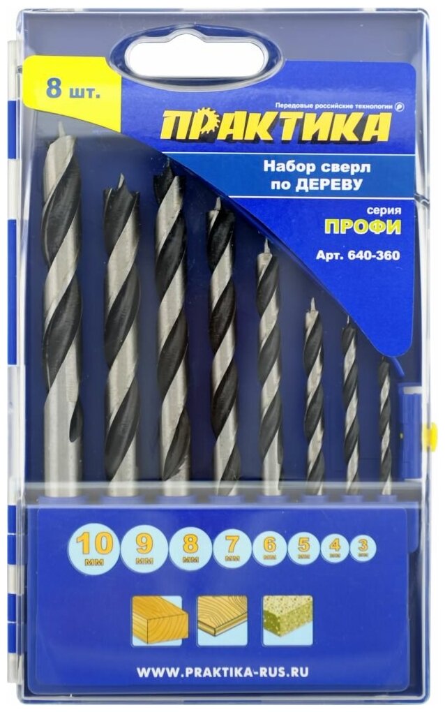 Набор сверл по дереву ПРАКТИКА "Профи", 8 шт, 3-10 мм, про кассета (640-360)