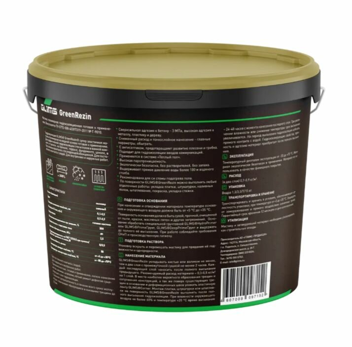 | Дополнительная информация | Гидроизоляция эластичная Glims GreenRezin 1.3 кг |