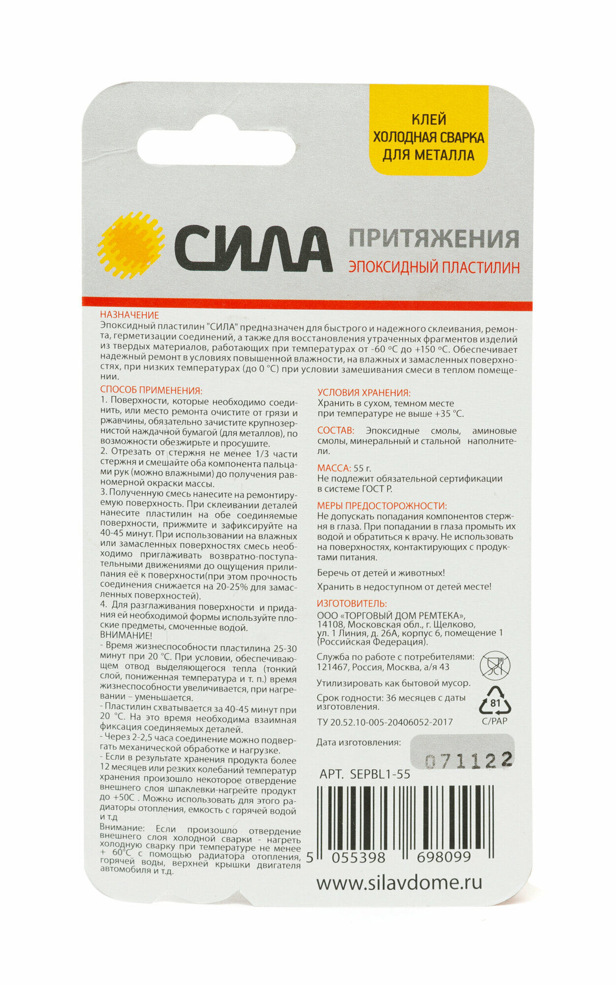 Ниже Вы можете прочитать отзывы на Сила Эпоксидный пластилин Холодная сварка 55 г. туба Б0013934, ознакомится с подробными характеристиками, посмотреть интересные обзоры и фотографии на Сила Эпоксидный пластилин Холодная сварка 55 г. туба Б0013934.