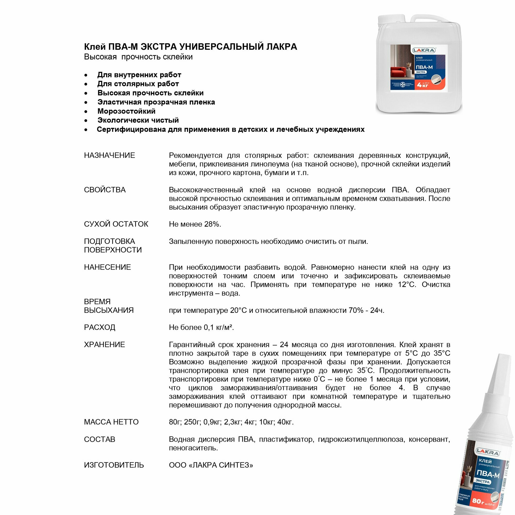 | Дополнительная информация | Клей ПВА-М ЛАКРА Экстра универсальный 0,25кг, арт.экстра-250 |