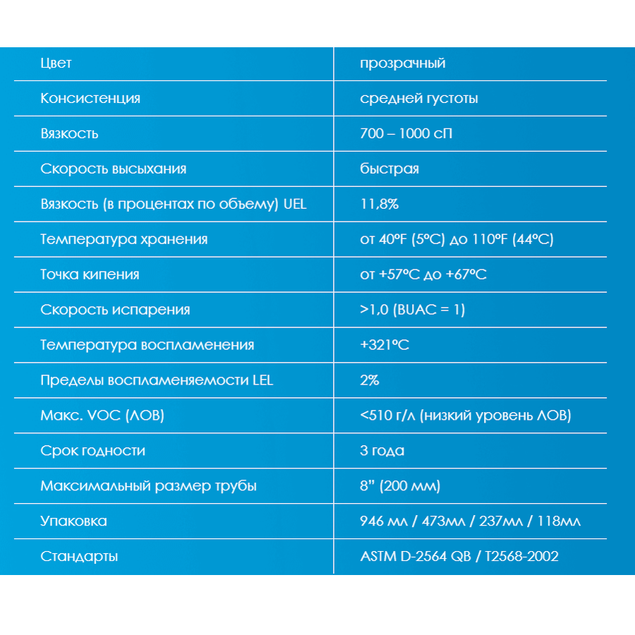 | Дополнительная информация | Практичная банка c кисточкой Этот клей средней вязкости имеет емкость 0,237 литра и может быть использован для труб диаметром до 200 мм. Он прозрачный и может использоваться для систем с питьевой водой без риска загрязнения. Подходит для систем с питьевой водой |