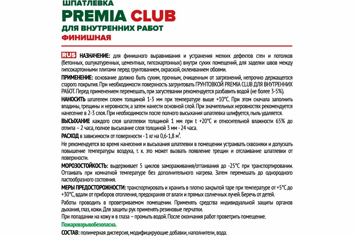 Premia Club Шпатлевка финишная для внутренних работ, ведро 3,5 кг О03948 интересное: