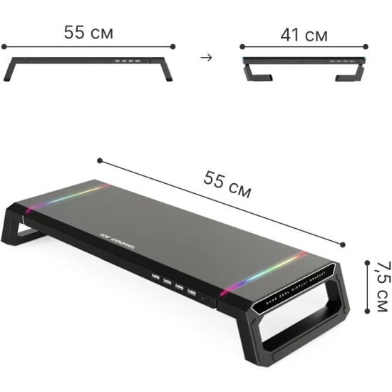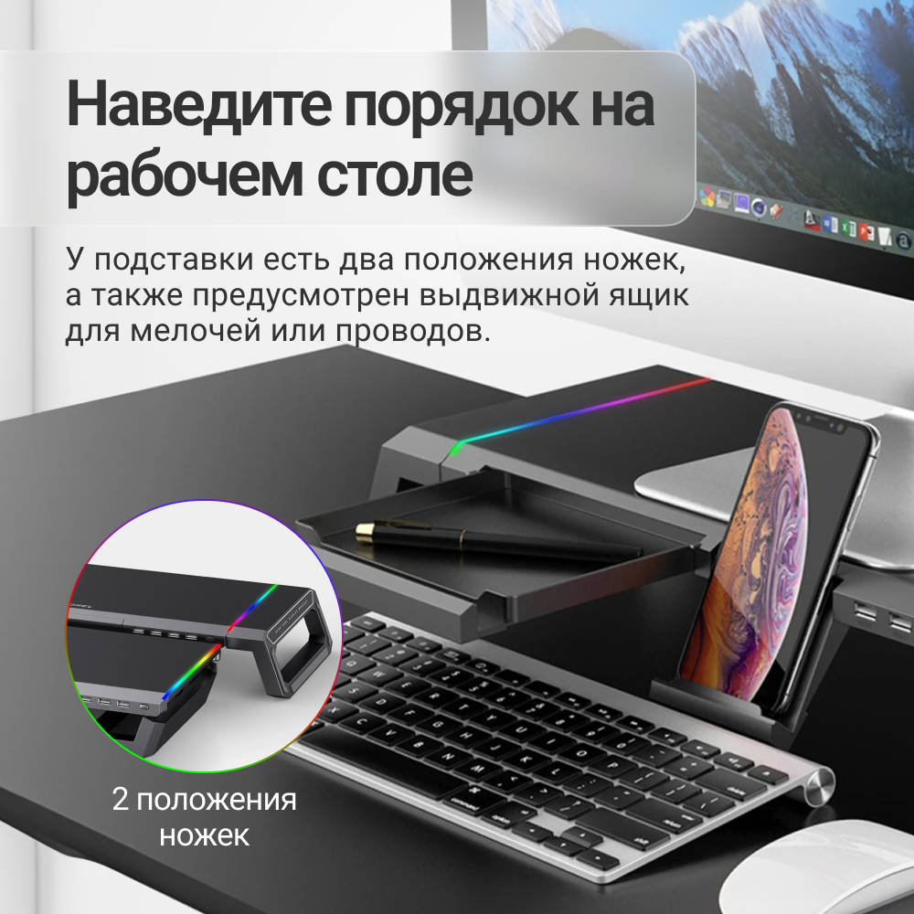 Подставка для монитора настольная складная / органайзер полка под монитор для компьютера с RGB подсветкой USB, с выдвижными ящиками для смартфона интересное: