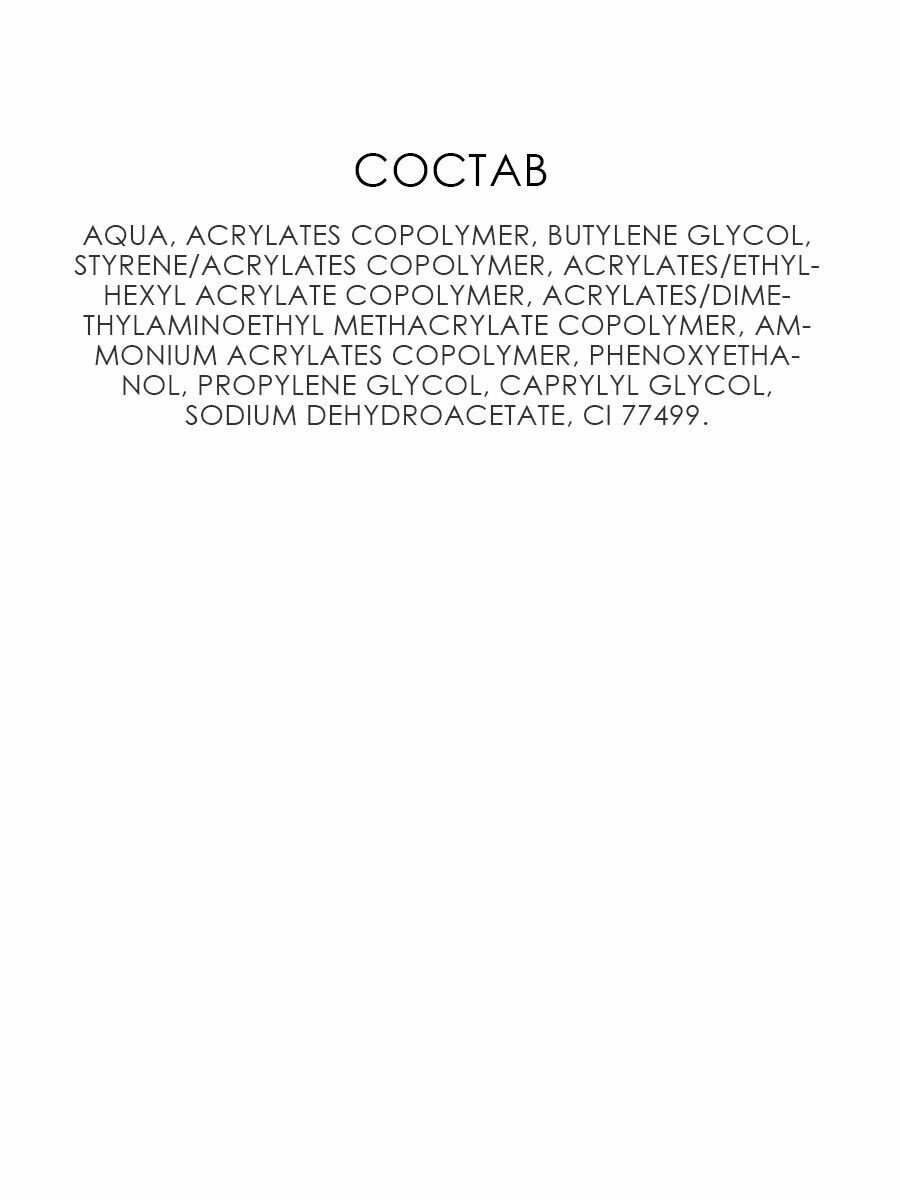 | Состав | aqua, acrylatescopolymer, butyleneglycol, styrene/acrylatescopolymer, acrylates/ethylhexylacrylatecopolymer, acrylates/dimethylaminoethylmethacrylatecopolymer, ammoniumacrylatescopolymer, phenoxyethanol, propyleneglycol, caprylylglycol, sodiumdehydroacetate, ci 77499 |