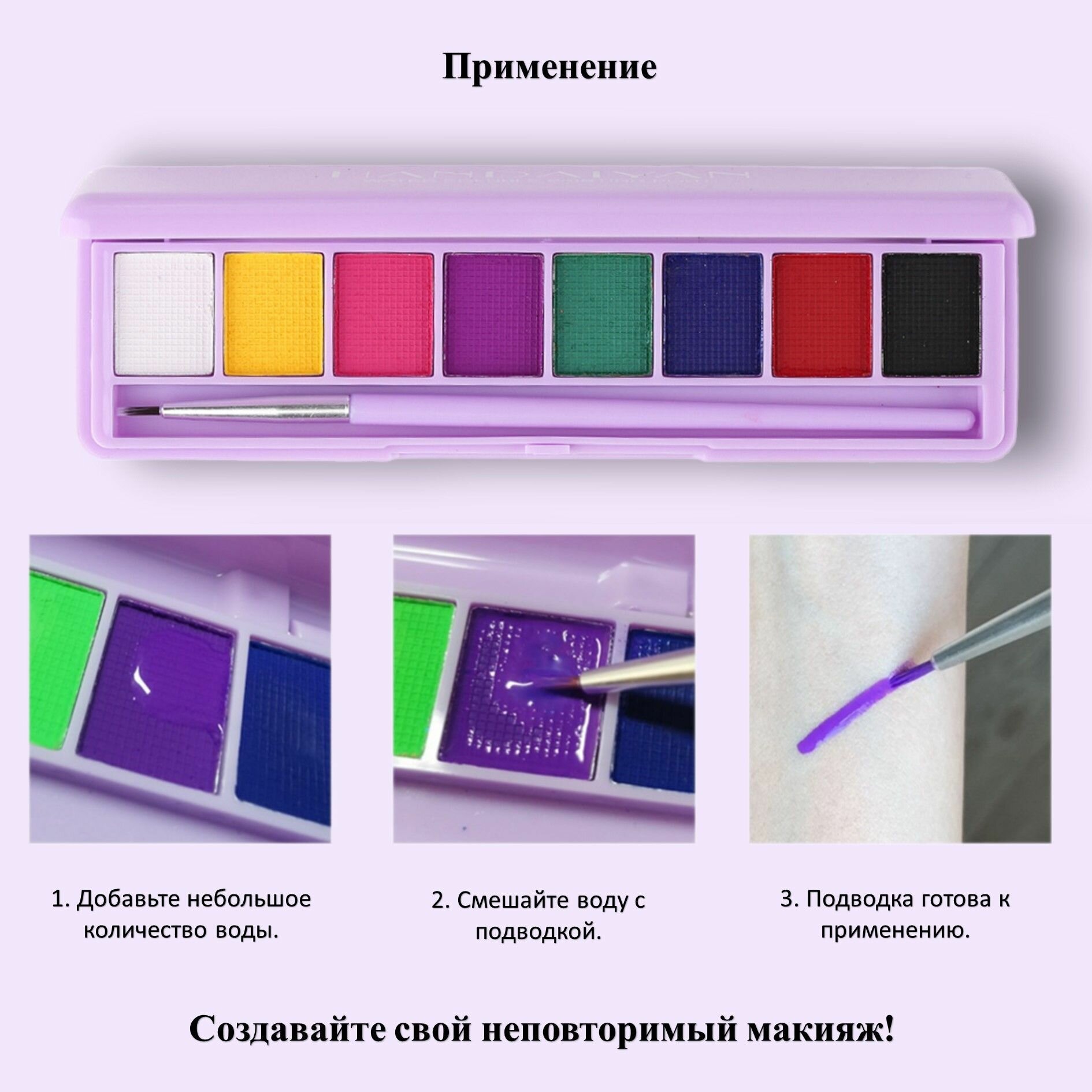| Способ применения | Небольшое количество воды добавить в нужный оттенок, смешать воду с пигментом, можно использовать подводку. После нанесения подождать пока высохнет. Косметика имеет стойкий пигмент и будет держаться до 12 часов, не размажется и не оставит следов. Смыть их можно водой или любым средством для снятия макияжа. Можно использовать как тени для век и для арт-рисунков на лице и на теле. |