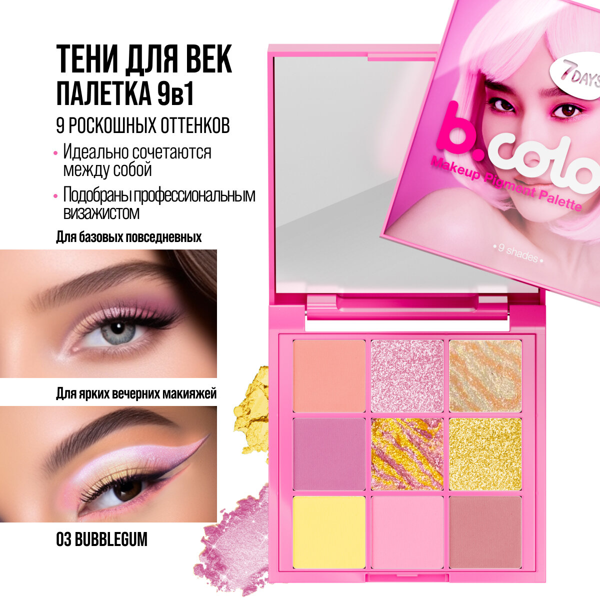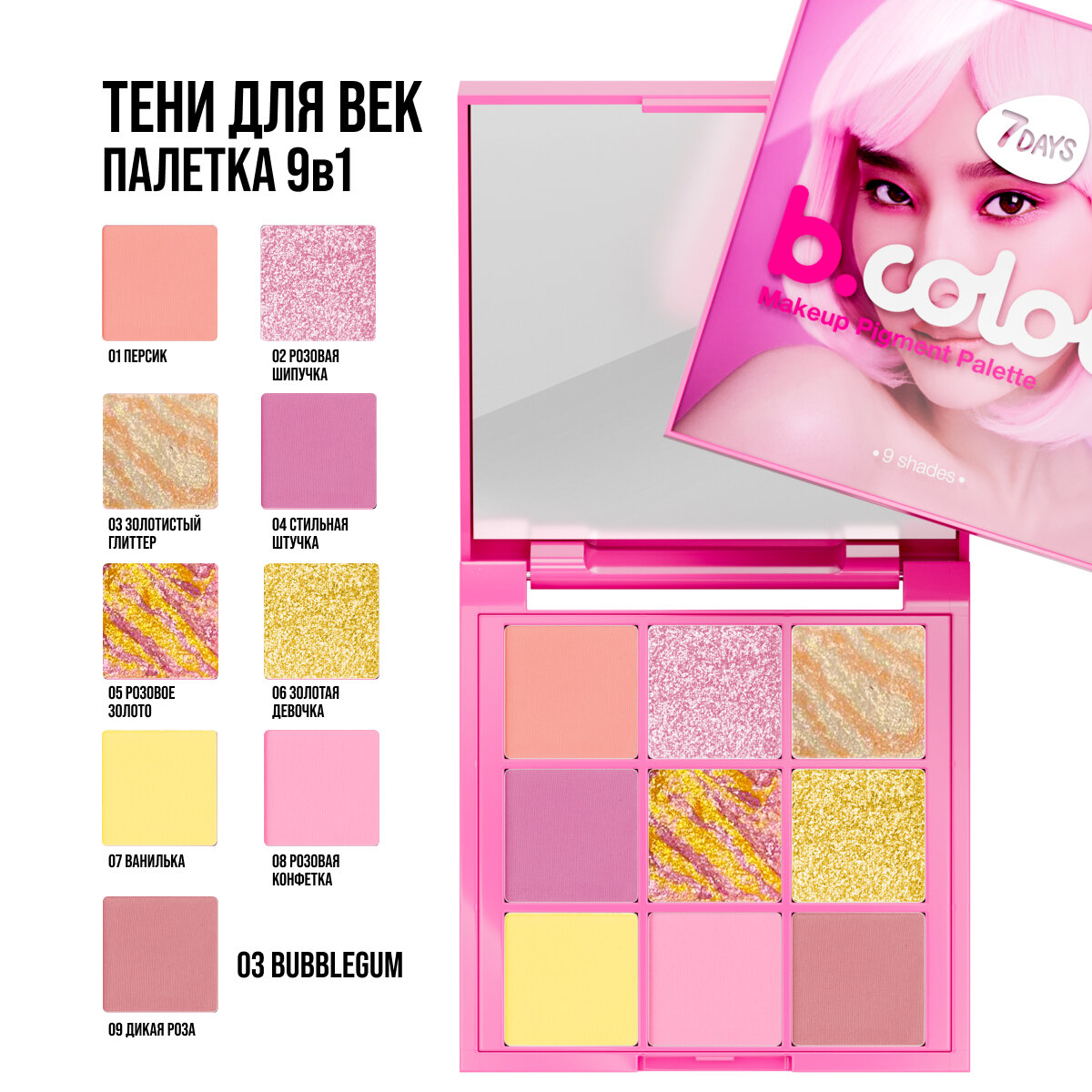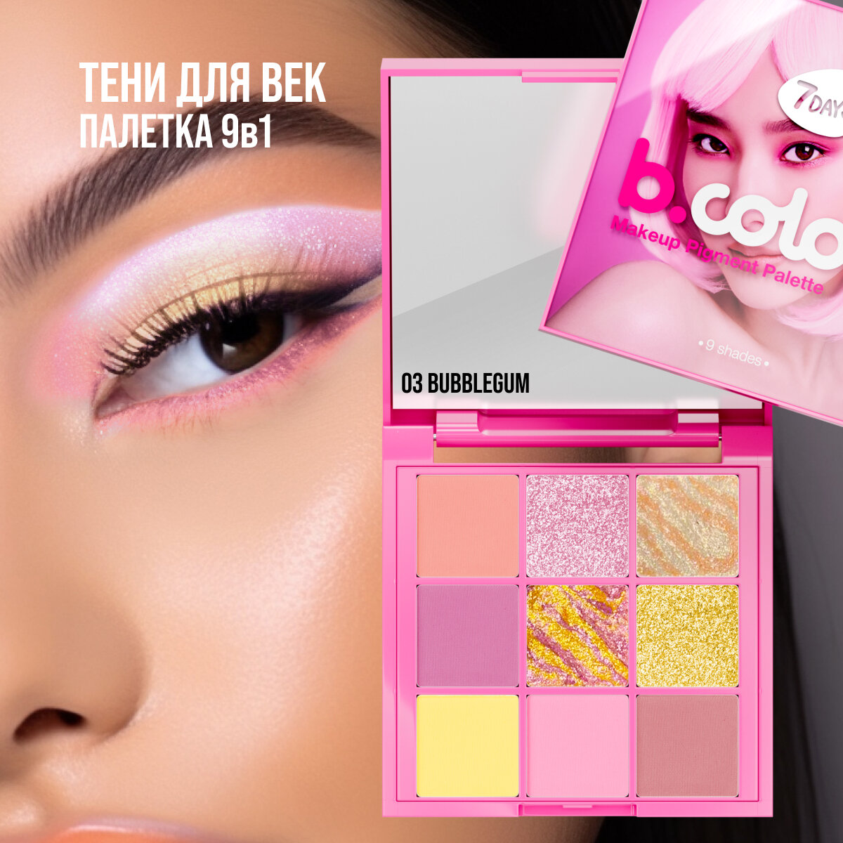 Тени для век палетка 7DAYS B.COLOUR матовые, блестящие, стойкие, 9 оттенков 03 BUBBLEGUM