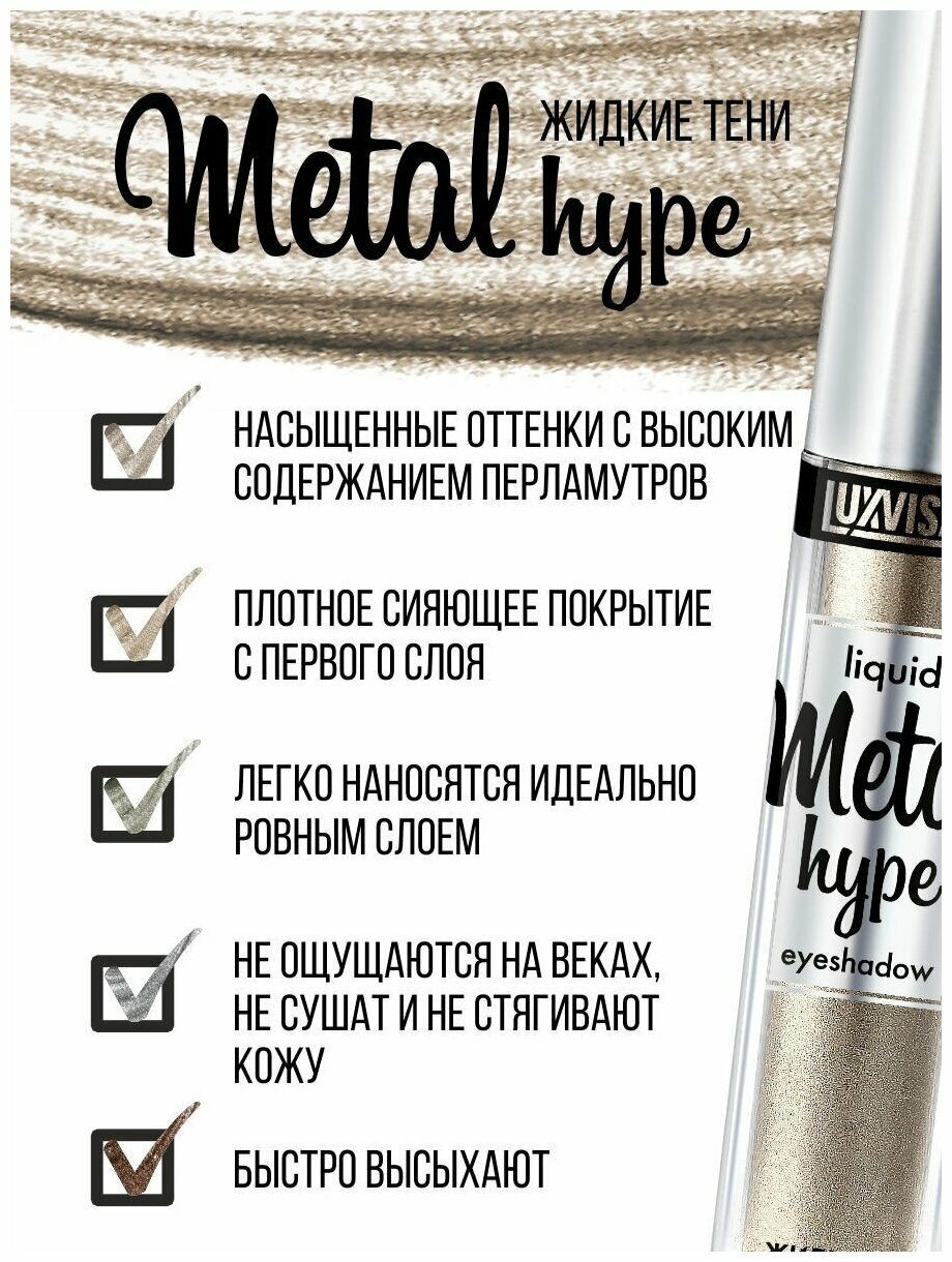 | Дополнительная информация | Жидкие тени для век Metal hype стойкие с металлическим сиянием. Насыщенные цвета с высоким содержанием перламутровых пигментов создают плотное мерцающее покрытие с первого слоя. Тени быстро высыхают, равномерно наслаиваются и растушевываются, сохраняют яркость цвета и сияние до 12 часов. Не требуют базы под тени. Содержат увлажняющие и смягчающие компоненты. |