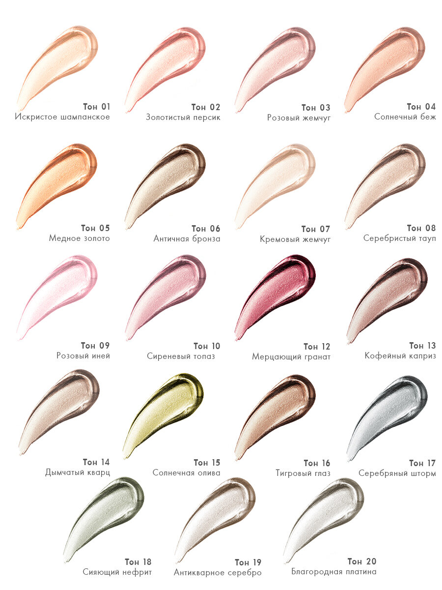 | Финиш | бархатный / влажный / глиттер / матовый / металлик / перламутровый / сатиновый / шиммер |