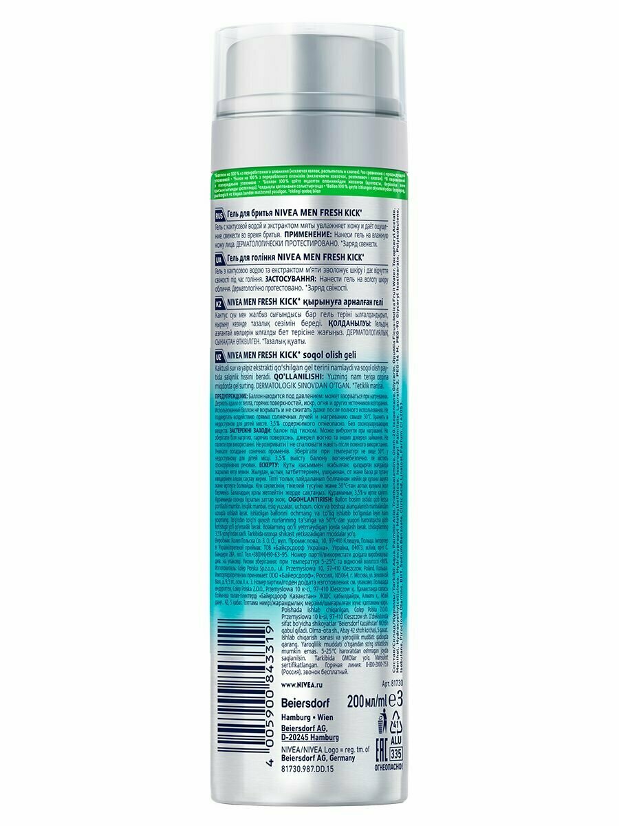 Nivea Men Гель для бритья FRESH KICK приятная свежесть, мята и кактусовая вода 200 мл - 1 шт