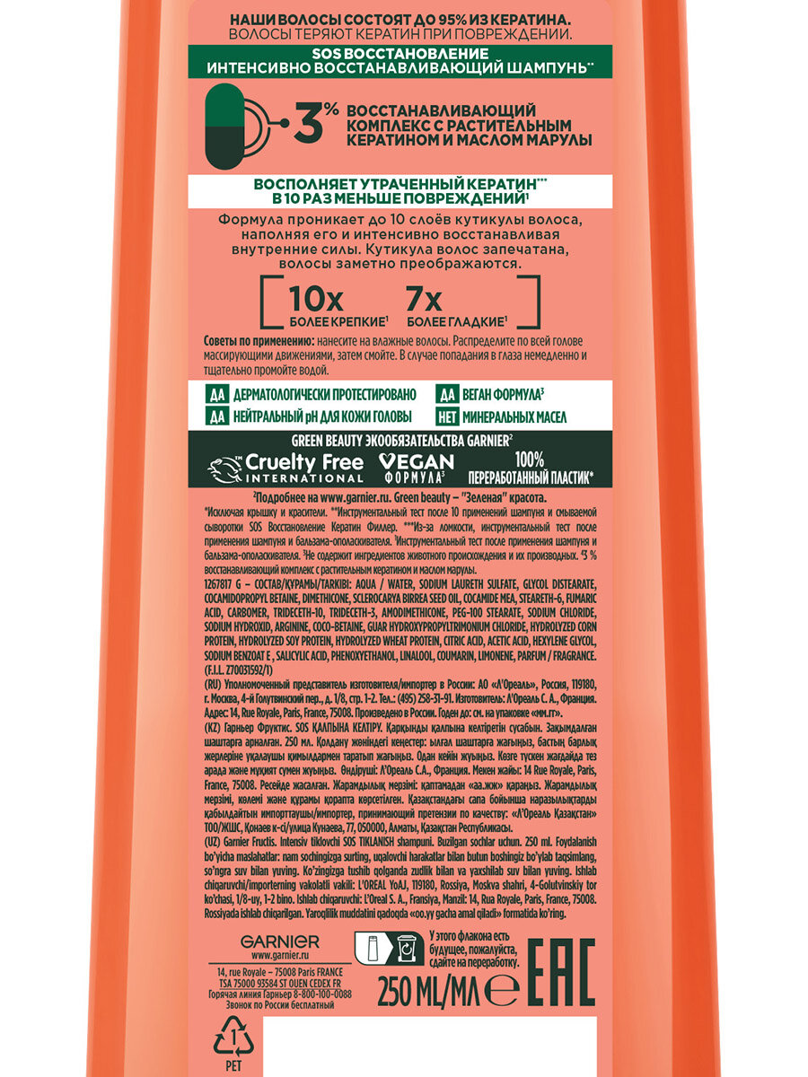GARNIER Шампунь для секущихся и очень поврежденных волос Fructis SOS Восстановление, 250 мл