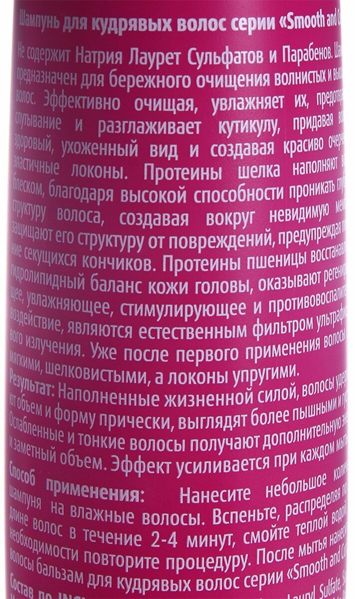 | Способ применения | после использования шампуня нанесите на влажные волосы бальзам, равномерно распределив его по всей длине. Оставьте на 3-5 минуты и смойте теплой водой. подходит для частого использования. Для оптимального ухода используйте шампунь для кудрявых волос серии «Smooth and Curly» |