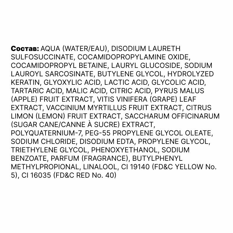 | Состав | AQUA (WATER), SODIUM LAURETH SULFATE, COCAMIDE DEA, SODIUM CHLORIDE, COCAMIDOPROPYL BETAINE, POLYQUATERNIUM-7, PARFUM (FRAGRANCE), PEG-5 COCOMONIUM METHOSULFATE, STYRENE/ACRYLATES COPOLYMER, HYDROLYZED KERATIN, GLYOXYLIC ACID, SODIUM GLUTAMATE, PANTHENOL, PROPYLENE GLYCOL, LAURDIMONIUM HYDROXYPROPYL HYDROLYZED KERATIN, HYDROXYPROPYL GUAR HYDROXYPROPYLTRIMONIUM CHLORIDE, SODIUM COCOYL GLUTAMATE, PHENOXYETHANOL, PROPYLPARABEN, BUTYLPARABEN, METHYLPARABEN, ETHYLPARABEN. |