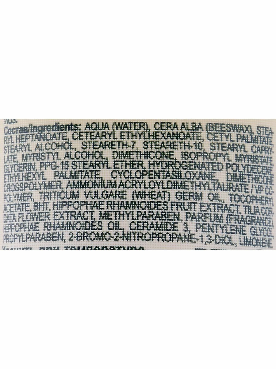 | Состав | вода, пчелиный воск, цетеарилэтилгексаноат, стеариловый спирт, стеарилгептаноат, цетилпальмитат, стеарет-7, стеарет-10, стеарилкаприлат, миристиловый спирт, гидрогенизированный полидецен, глицерин, стеариловый эфир ппг-15, этилгексилпальмитат, циклометикон, кросполимер диметикона, пропиленгликоль, экстракт облепихи и цветков липы, масло облепихи, керамиды-3, пентиленгликоль, изопропилмиристат, аммониум акрилоилдиметилтаурат/вп сополимер, масло зародышей пшеницы, витамин е, внт, парфюмерная композиция, метилпарабен, пропилпарабен, 2-бром-2-нитропропан-1,3-диол |