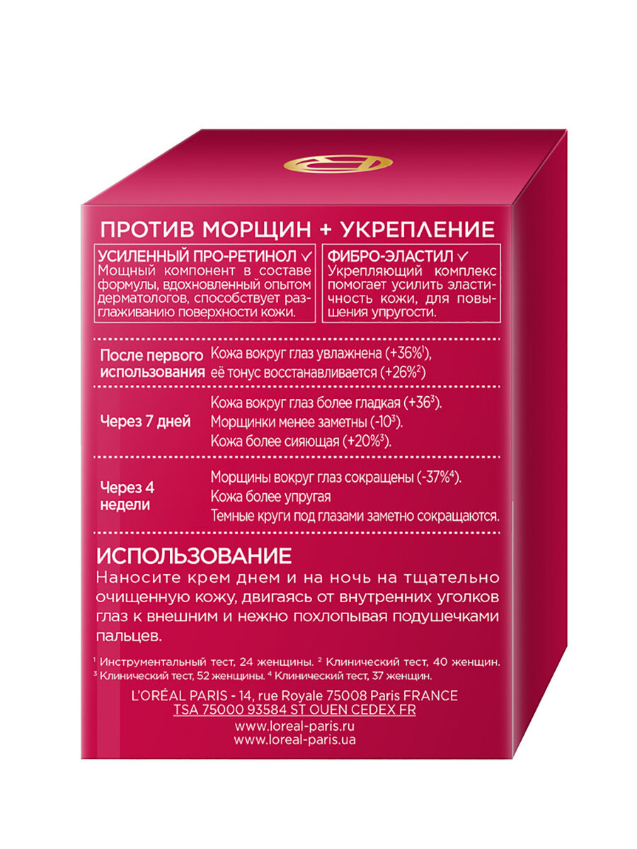 | Дополнительная информация | в состав средства входит усиленный Про-Ретинол, разглаживающий морщины, и активный укрепляющий комплекс Фибро-Эластил, который помогает усилить эластичность кожи |