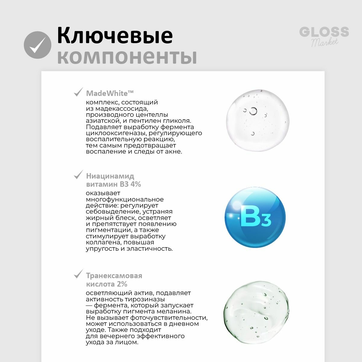 | Активный ингредиент | антиоксиданты / аргинин / бетаин / витамин B3 (ниацинамид) / витамин C (аскорбиновая кислота) / витамины / гиалуроновая кислота / глицерин / лактобактерии / лецитин / мадекассосид / пантенол (провитамин B5) / пептиды / транексамовая кислота / центелла азиатская / церамиды |