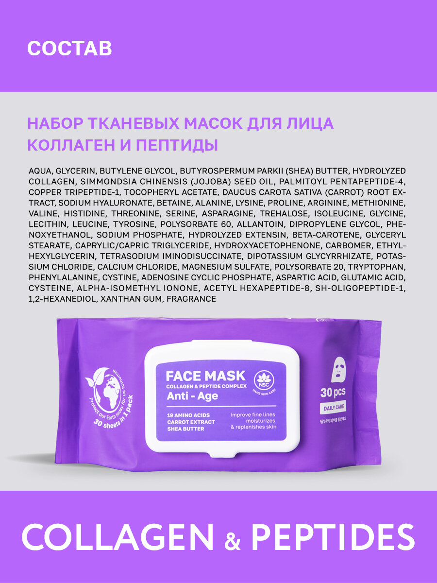 Купить NSC Тканевые маски для лица Коллаген и Пептиды, набор 30 штук