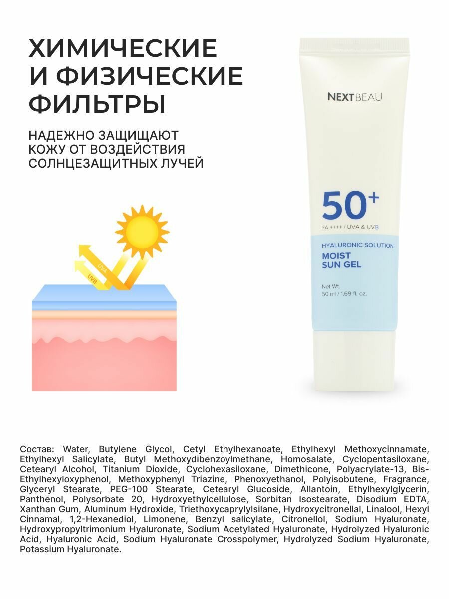 NEXTBEAU Увлажняющий солнцезащитный гель, крем флюид SPF 50 Корея. Hyaluronic Solution Moist Sun Gel, 50ml. Уходовая корейская косметика средства для защиты от солнца интересное: