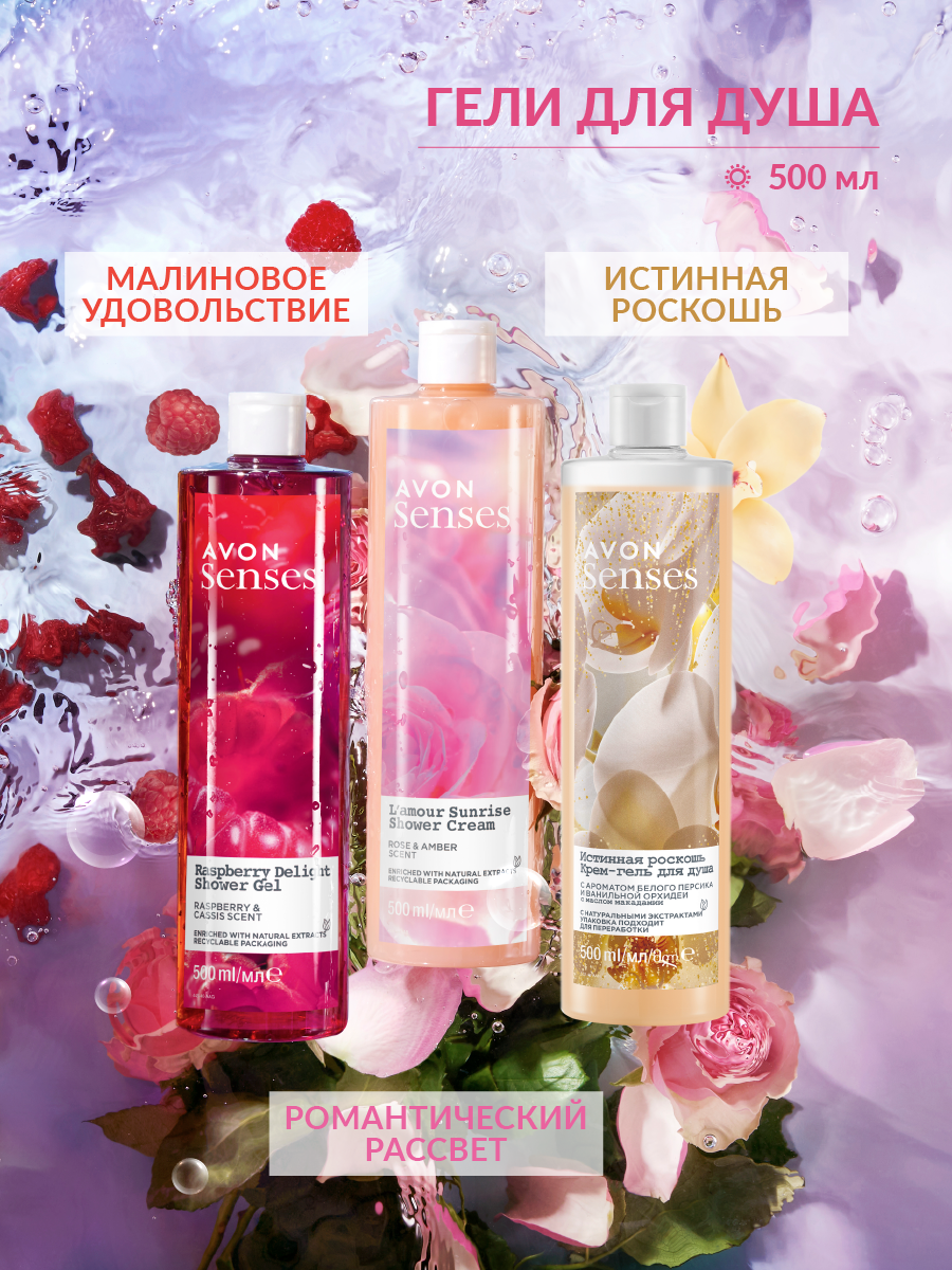 AVON/Эйвон Набор гелей для душа Senses (Сенсес) Истинная роскошь, Романтический рассвет, Морская лагуна, 500мл
